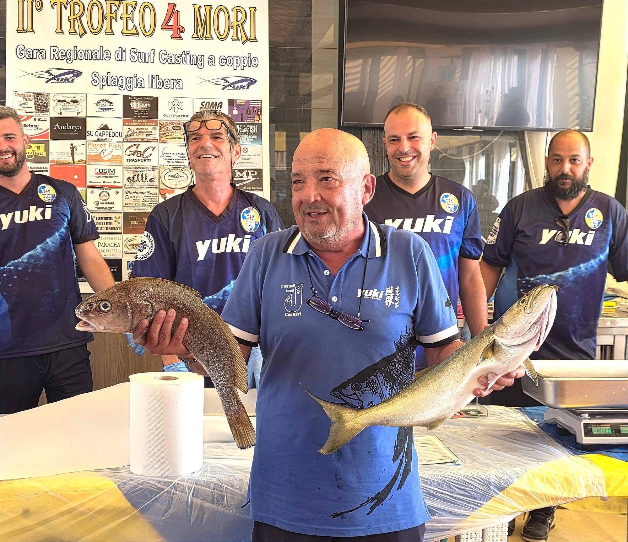 Marco Mossa e Daniele Bullitta (Coxinas Villacidro), detentori del trofeo della prima edizione, quando fra l’altro gareggiavano sotto l’egida dei Quattro Mori raccontano: “abbiamo scelto Quirra perché è una spiaggia profonda con presenza di varie specie di pesci. Quasi subito, a inizio battuta, abbiamo avuto varie beccate da parte delle occhiate che fortunatamente hanno continuato a mangiare per quasi tutta la gara. In più qualche mormora ha arricchito il carniere... diciamo che ci siamo divertiti.”. A fianco a Marco e Daniele ci sono Massimo Masala e Massimo Cabras del Ploaghe Fishing Club, altri due espertissimi pescatori, veri e propri pezzi da 90. Anche per loro sin dai primi lanci, un po’ inaspettatamente, le cose si mettono benissimo in quanto a numeri di prede, e anche in questo caso tante occhiate. D’altra parte tutta quell’attività comporta un non trascurabile dispendio di energie, tanto più quando le abboccate si fanno più rade ed è necessario cambiare fascia di pascolo, allungando i lanci. Un compito arduo ma assolto impeccabilmente, e poi vedremo perché. Leo Loddo e Ernesto Leonori del JCasting Team decidono di battere Arborea. Loddo: “Il primo pesce è un’ombrina di circa 1,3 chili, pescata col coreano rosso. Il mare di maestrale era abbastanza mosso con molte alghe sul gradino. Dopo la bestiolina è uscito qualche altro pesce fuori misura, poi il niente. Lì ho pensato al serra, ho cambiato canna e messo il trancio. Dopo una mezz'ora è partito il serra di 2 chili. Durante la notte è girato a ponente, i granchi blu (uno l'ho preso) tagliavano i braccioli in continuazione. È uscita qualche mormora in misura e qualche sparlotta. Molta minutaglia.”.