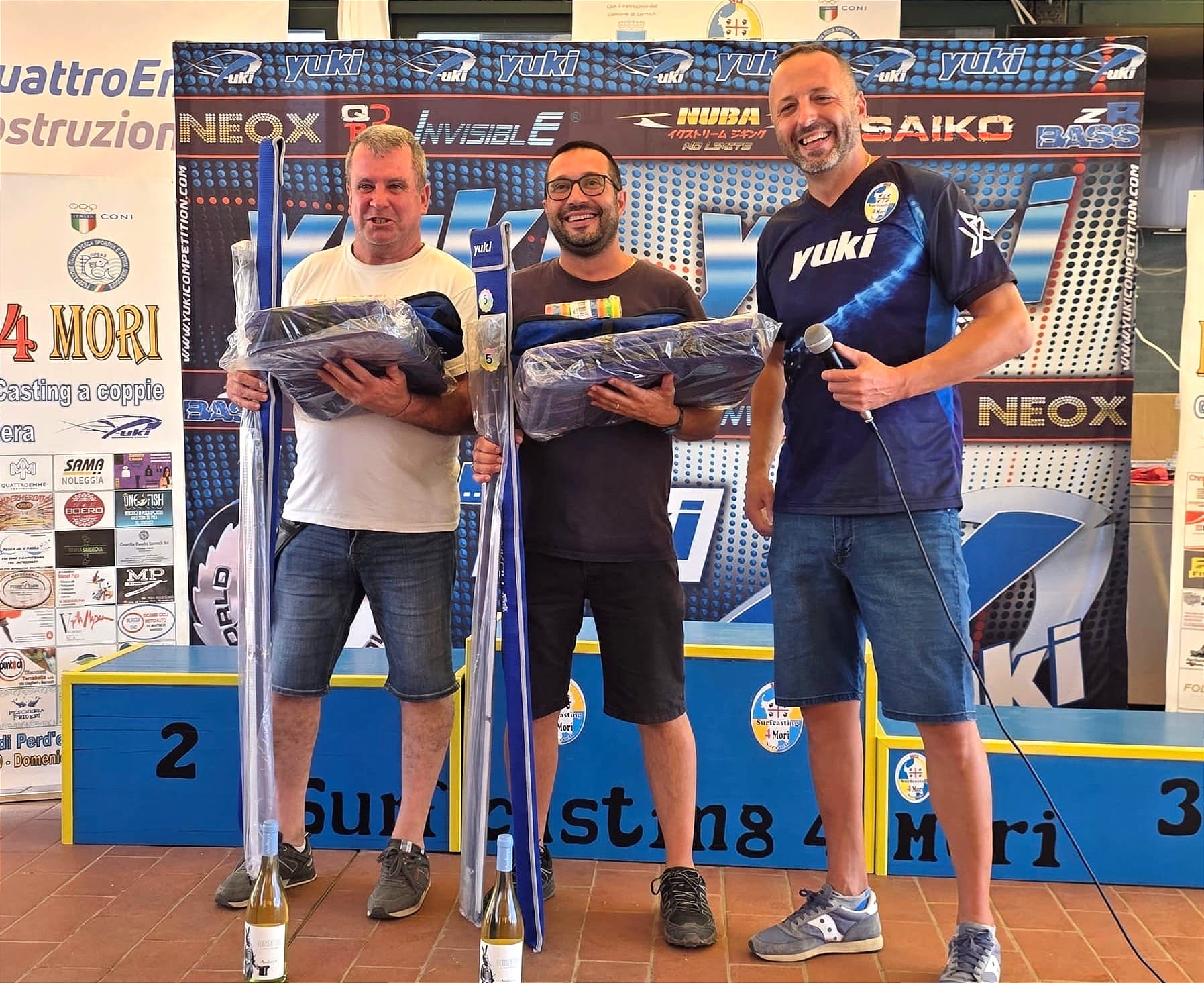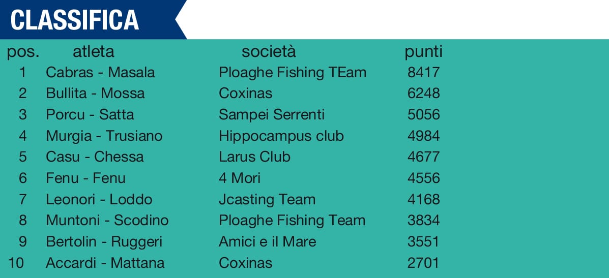 A questo punto, com’è finita la gara? Marco Mossa e Daniele Bullitta sfiorano un magico bis, ma hanno dovuto cedere il passo proprio a Massimo Cabras e Massimo Masala (Ploaghe Fishing Club), loro compagni di equipaggio, che con 58 prede e oltre 8000 punti centrano la vittoria finale. Il box Satta-Porcu si è insediato sul gradino più basso del podio, uno scintillante terzo posto per loro, mentre i compagni di ventura Chessa-Casu agguantano la quinta posizione. La coppia Accardi-Mattana ha staccato l’ultimo biglietto valido, quello del 10° posto, per accedere ai ricchi premi che lo sponsor tecnico Yuki e le altre ditte hanno firmato per Erasmo e soci.