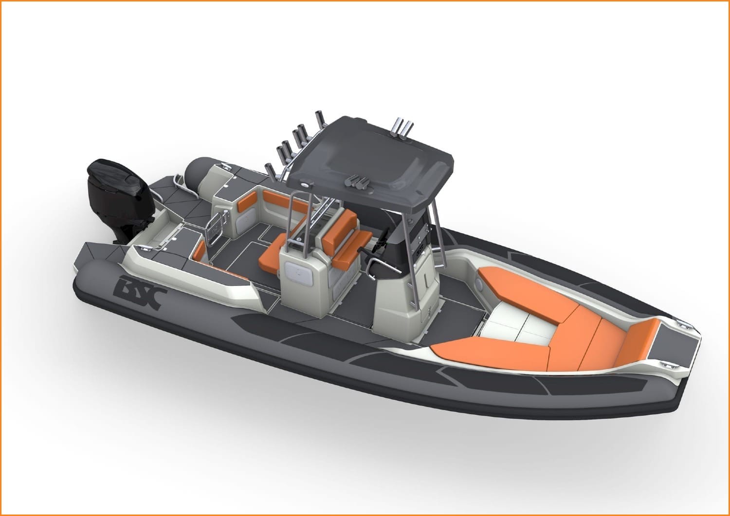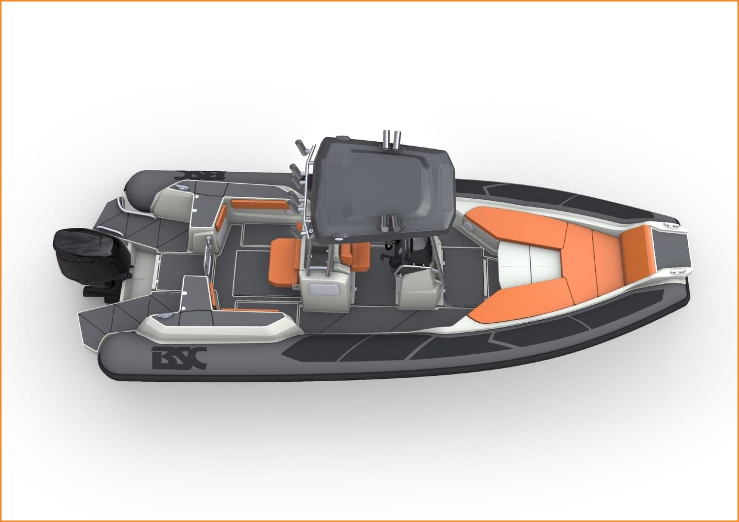 Il piano di coperta adotta un layout che si ispira alla filosofia BSC con ampi spazi a bordo e soluzioni studiate per dare un prodotto resistente e destinato a durare nel tempo: le mastre in vetroresina alte, capaci di offrire protezione, sono integrate con vasche del vivo; un corridoio centrale facilita il passaggio verso il pozzetto; le operazioni di carico del pescato dalla zona di poppa.