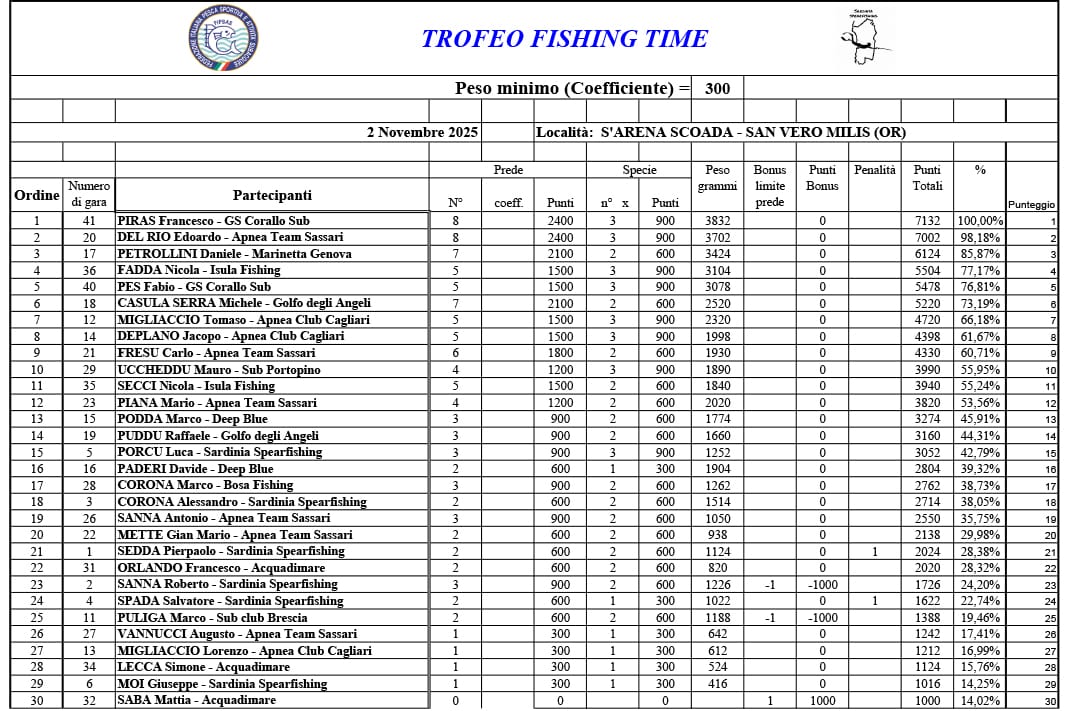 Terminata la competizione alle 12:30, atleti e giudici si sono ritrovati al ristorante “Entu e Sole”, dove, tra racconti di mare e convivialità, si è rinnovata la magia dello spirito sportivo che contraddistingue queste gare. Poi, come sempre, è stata la bilancia a riportare tutti all’adrenalina della classifica finale.