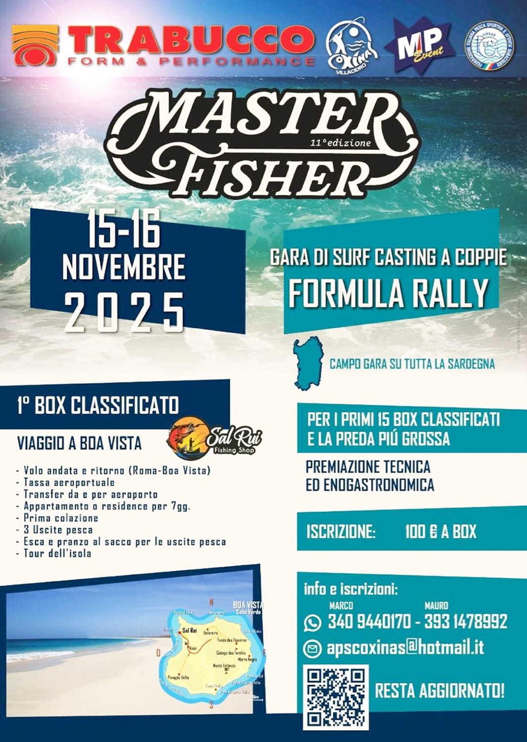 Il Master Fisher è un MP Event dalle tinte forti. In questa gara, che giunge all’undicesima edizione, si vive il surfcasting nella sua essenza: freddo, pioggia e vento, ma anche grandi catture e la calorosa accoglienza del Coxinas di Villacidro. Quest’anno la gara si disputerà nella notte tra sabato 15 e domenica 16 novembre. Formula rally a coppie, con campo gara che si estende a tutte le spiagge della Sardegna. La premiazione tecnica e gastronomica sarà ricchissima, grazie allo sponsor Trabucco e alle tante aziende che sostengono i coxineros ormai da tanti anni. Saranno premiati i primi 15 box classificati e ci sarà uno speciale premio per la preda più grossa. Ma soprattutto, i vincitori partiranno a Boa Vista per una settimana di pesca e relax!