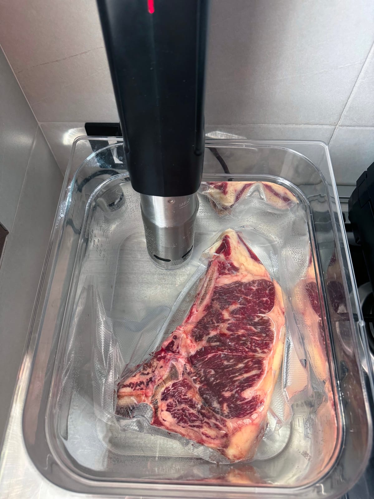 Pronti per il bagno - Con l’ausilio del roner, in un contenitore abbastanza capiente da contenere la bistecca, riscaldate l’acqua a una temperatura di 52 °C per ottenere una cottura al sangue. I tempi di cottura dipendono dallo spessore: per una bistecca di circa 5 cm di altezza considerate almeno 3 ore di cottura.