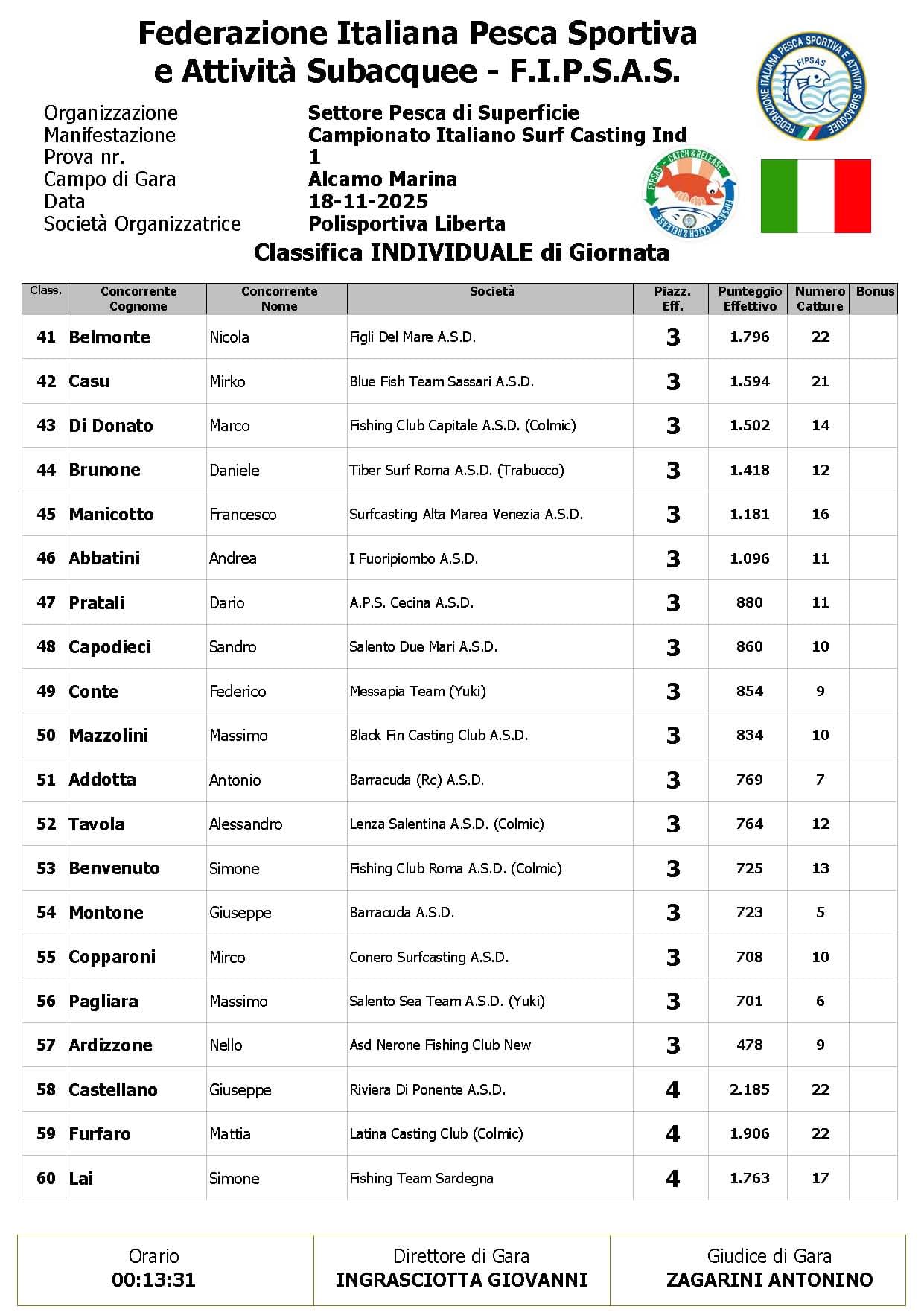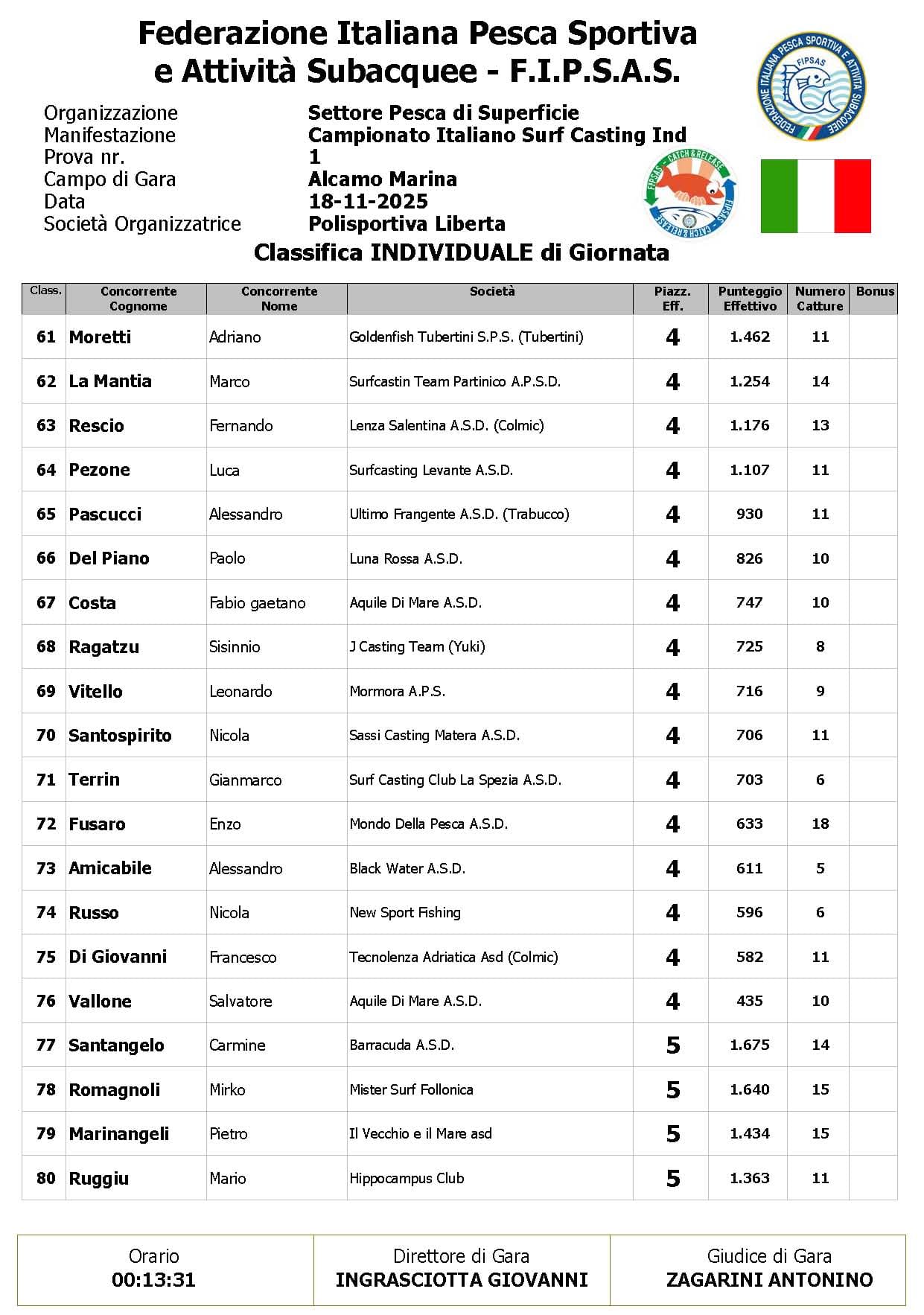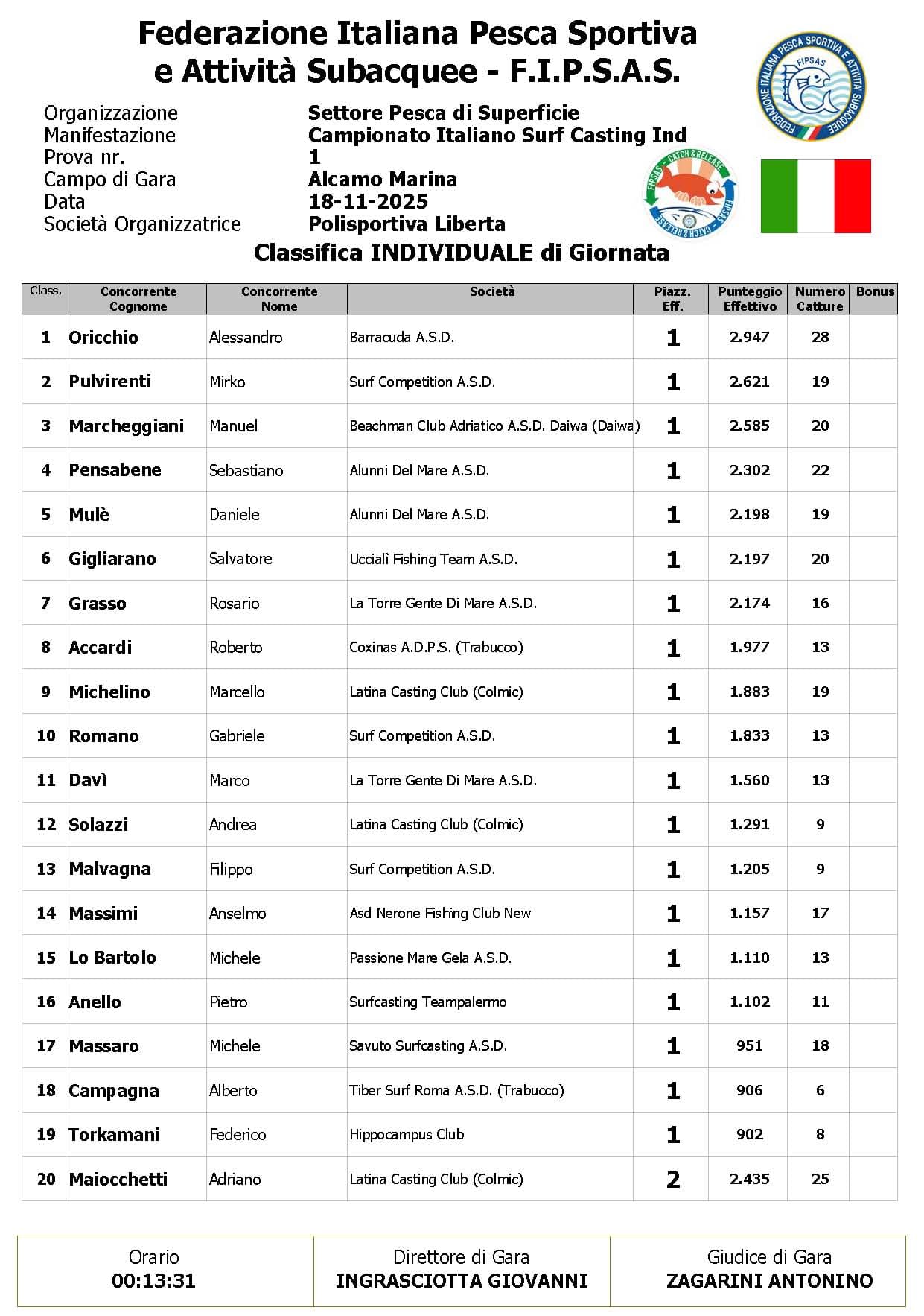 Al termine della gara, la classifica provvisoria vede Alessandro Oricchio (Barracuda Asd in testa, grazie a un’ottima prova da 2.947 punti e 28 catture. Seguono da vicino Mirko Pulvirenti (Surf Competition Asd e Manuel Marcheggiani (Beachman Club Adriatico Asd protagonisti anch’essi di una manche solida in un contesto tecnico e selettivo.