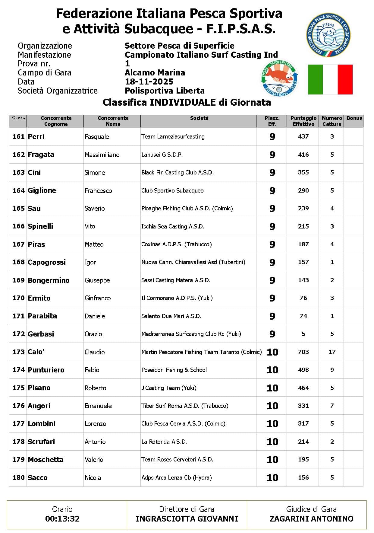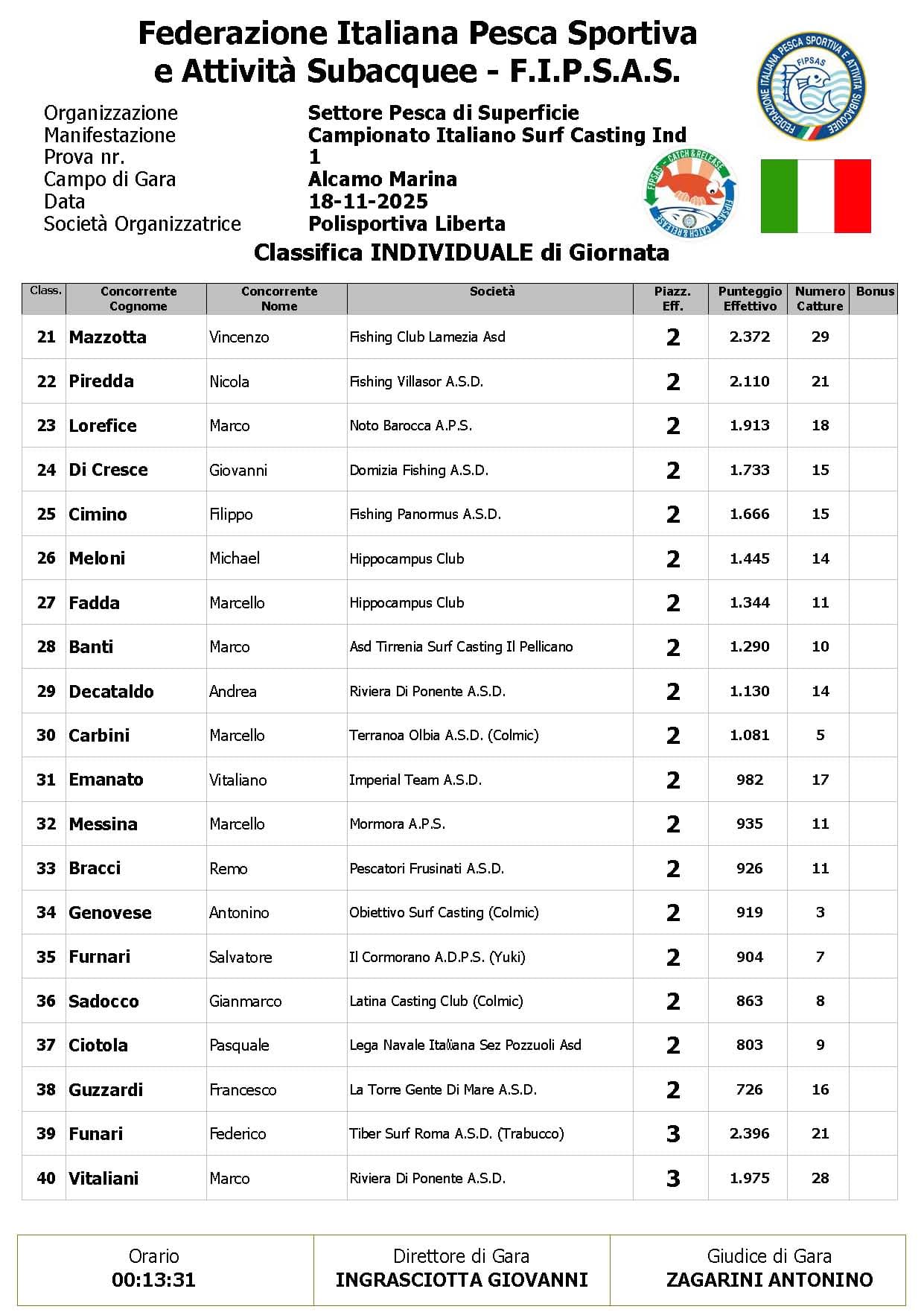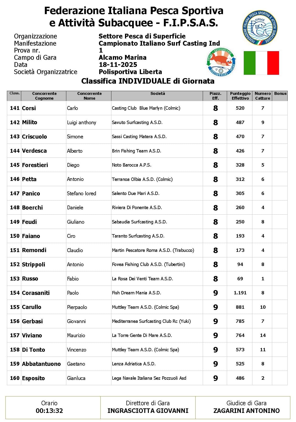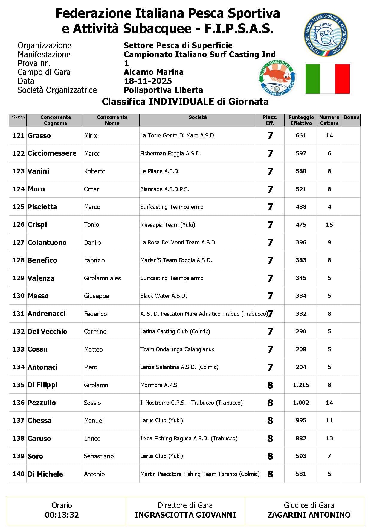 Al termine della gara, la classifica provvisoria vede Alessandro Oricchio (Barracuda Asd in testa, grazie a un’ottima prova da 2.947 punti e 28 catture. Seguono da vicino Mirko Pulvirenti (Surf Competition Asd e Manuel Marcheggiani (Beachman Club Adriatico Asd protagonisti anch’essi di una manche solida in un contesto tecnico e selettivo.