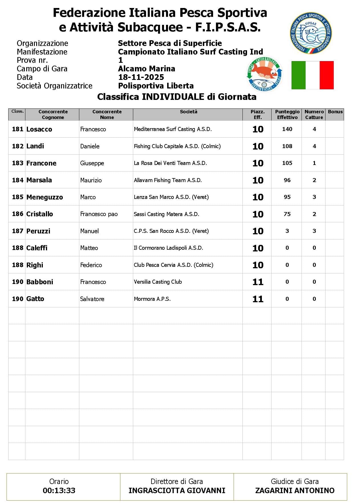 Nonostante l’assetto ideale, il pescato si è rivelato più avaro del previsto. Le prede hanno faticato a entrare in attività e persino lo scirocco, spesso protagonista nelle battute costiere, sembrava “spaventato”, lasciando la scena a sporadiche catture. Scarse le risposte delle lecce stella, mentre a risollevare la classifica ci hanno pensato soprattutto le mormore, vere padrone di questa prima parte del campionato.