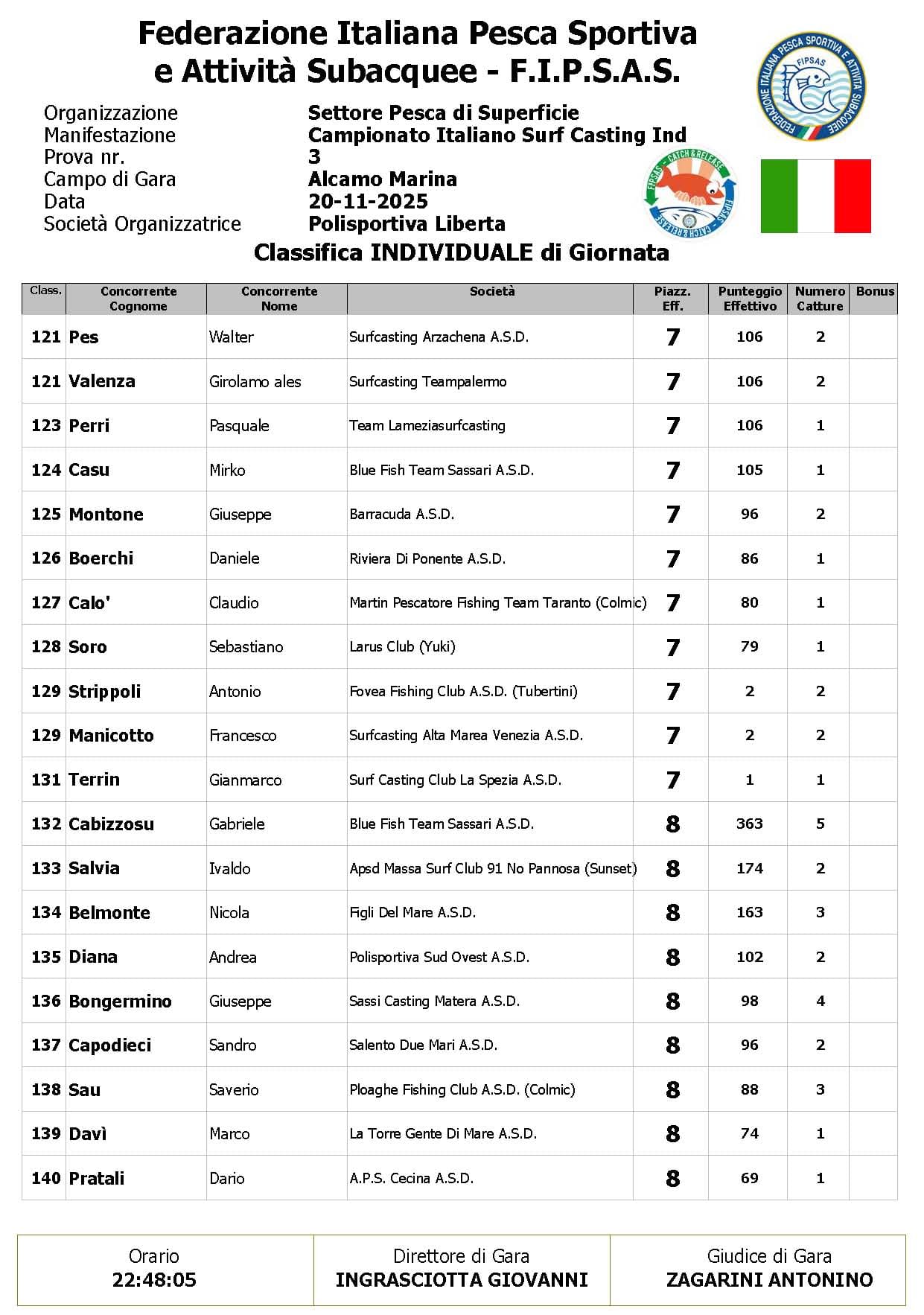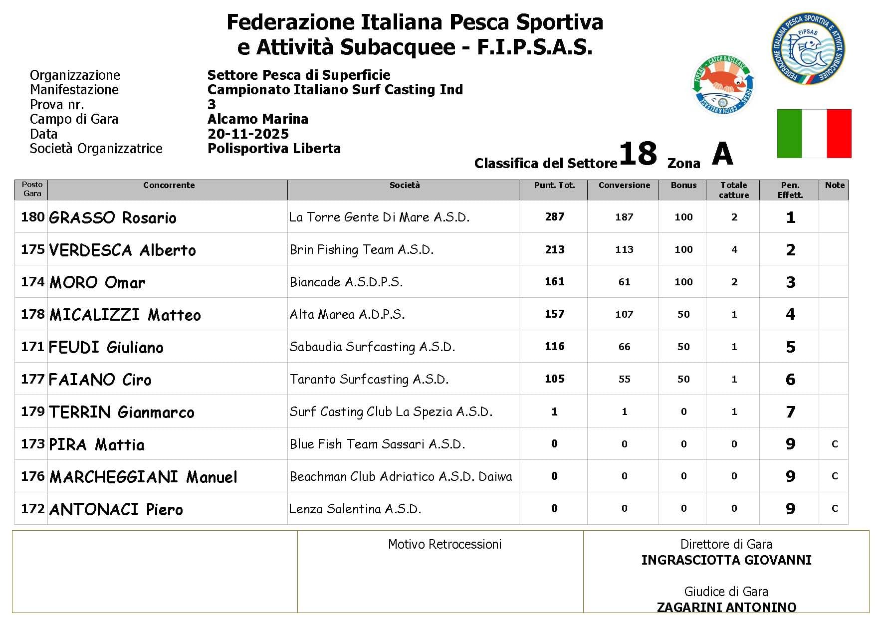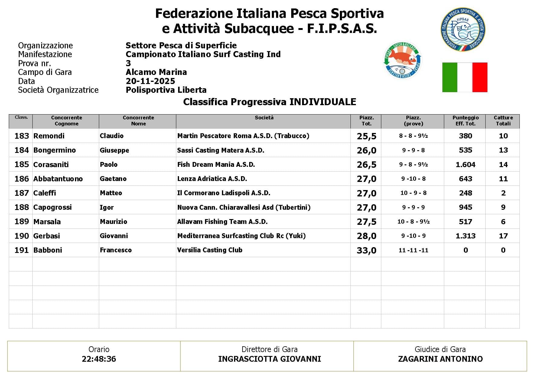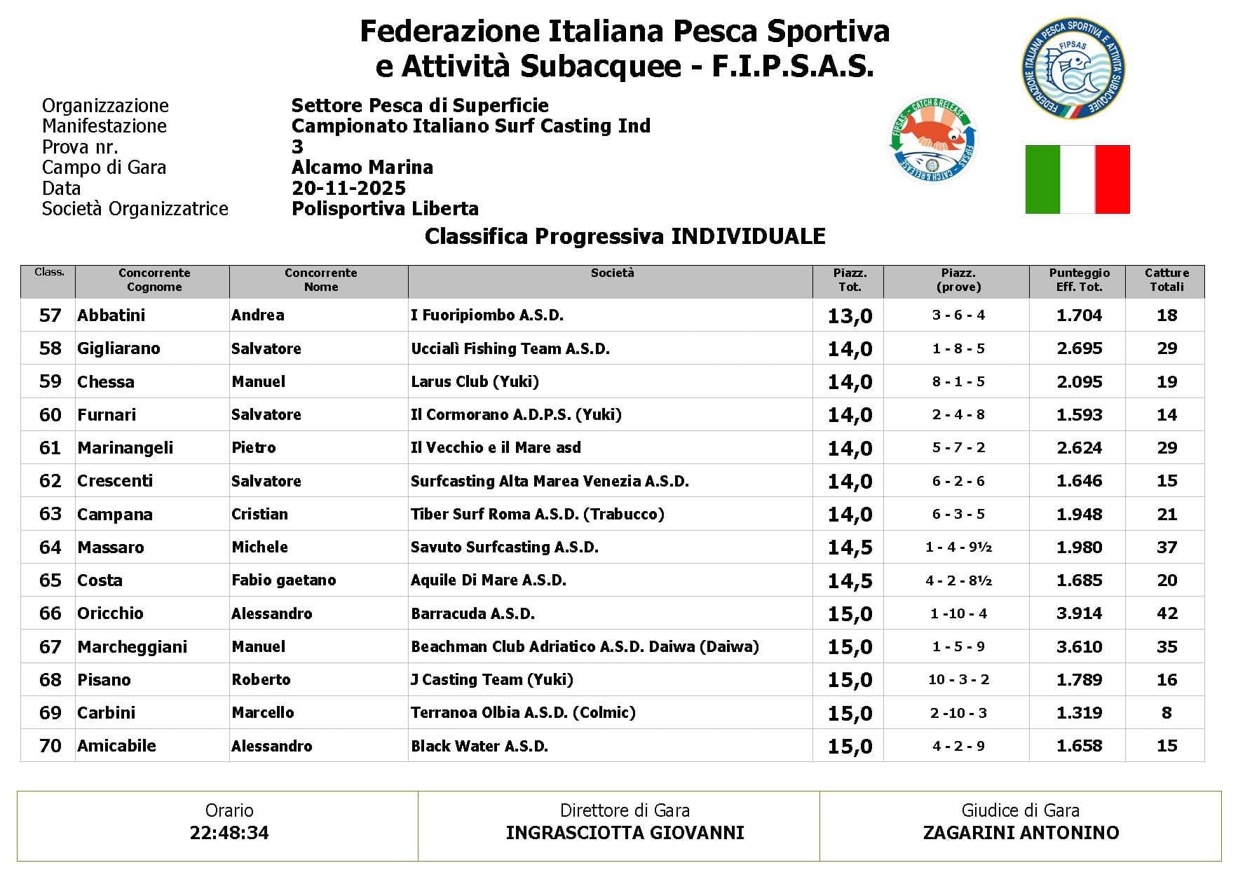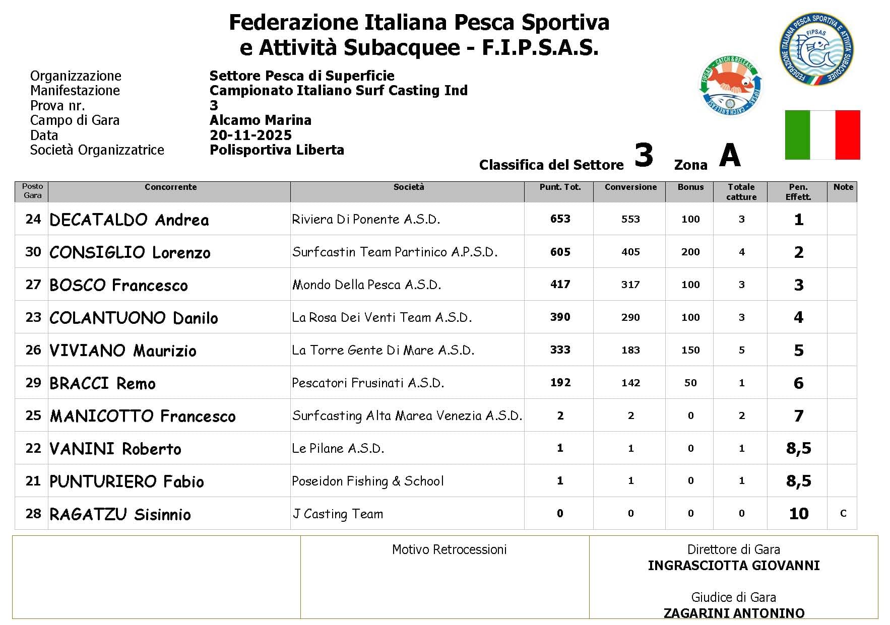 Si è conclusa anche la terza prova ,del Campionato Italiano di Surf Casting ad Alcamo Marina, una prova segnata dal netto peggioramento delle condizioni meteo rispetto alla giornata precedente. Come ampiamente previsto, un vento insistente ha iniziato a sollevare onde già prima del via, mentre una pioggia intensa ha accompagnato quasi tutta la prima ora di gara, mettendo subito alla prova concentrazione e tecnica dei partecipanti.