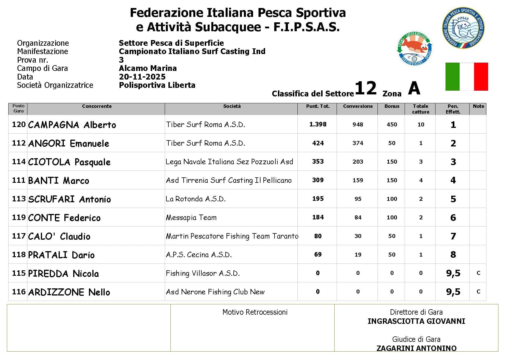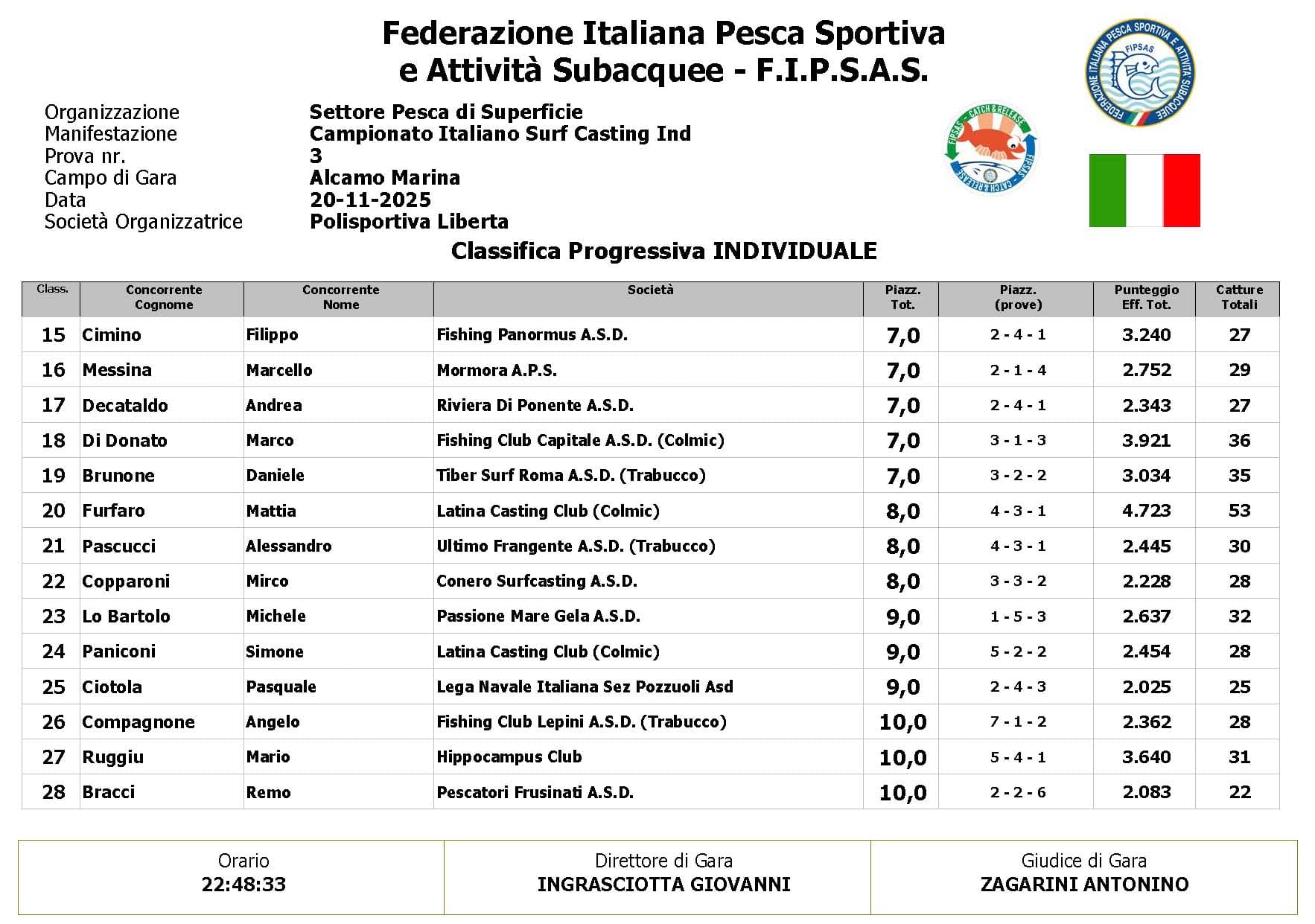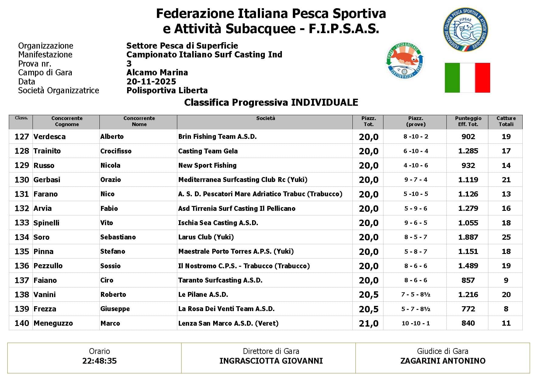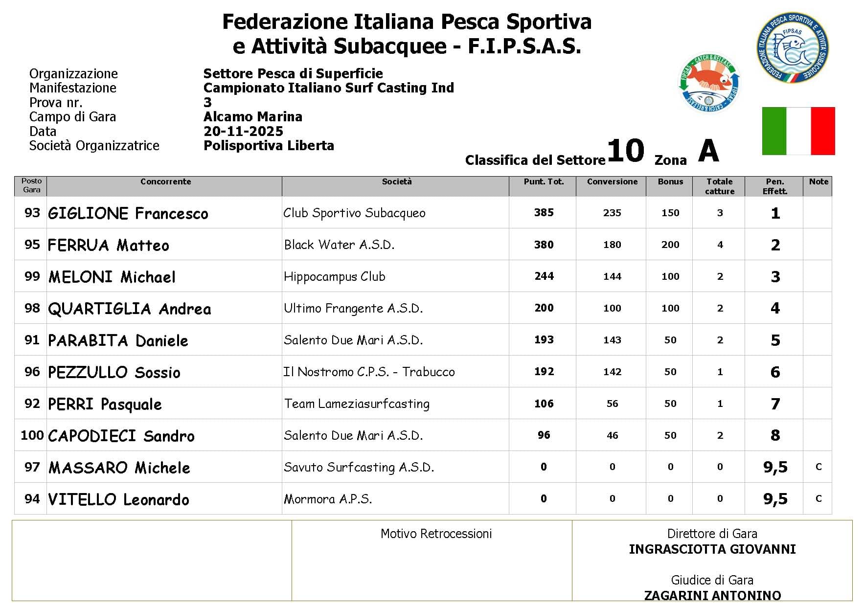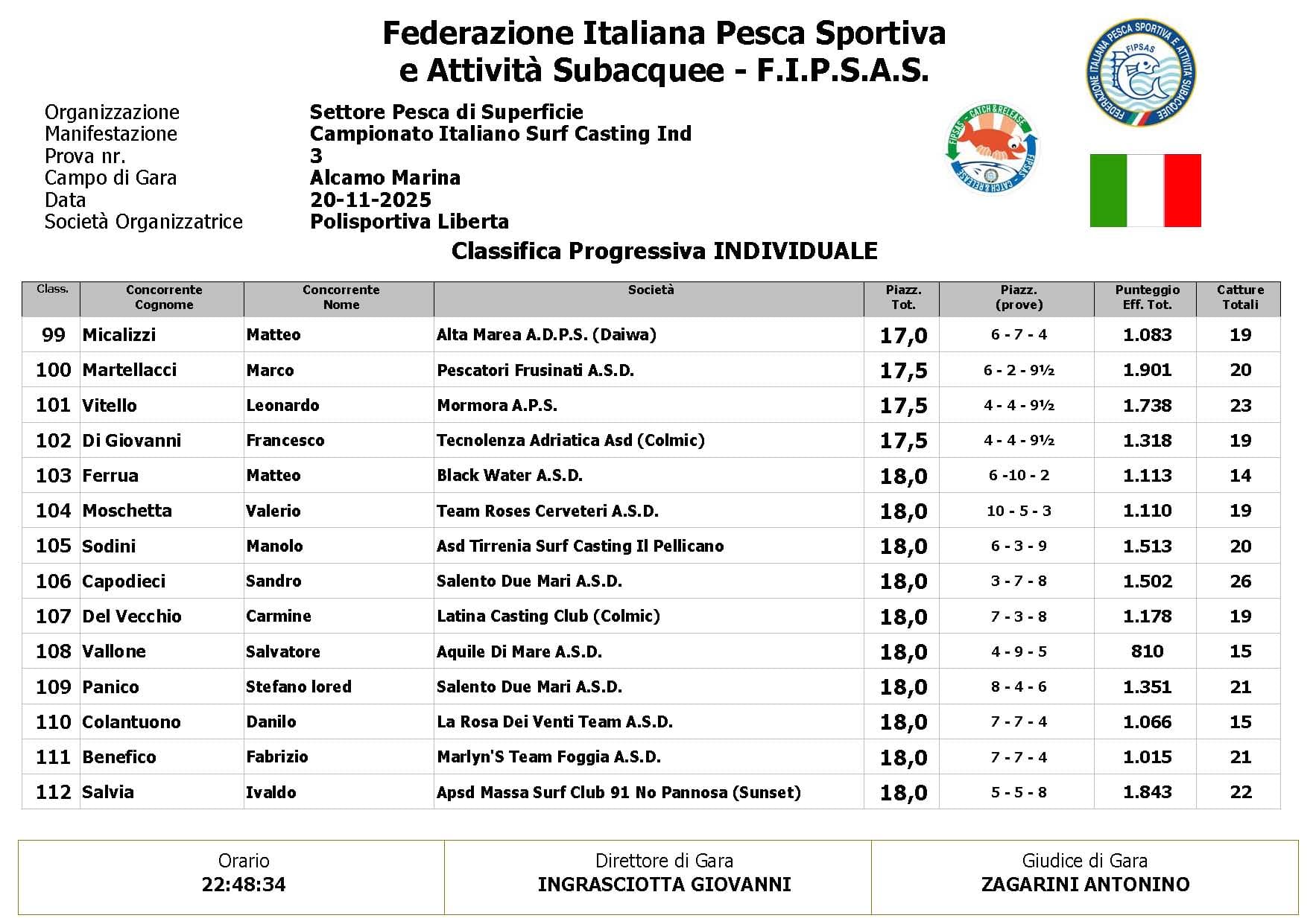 Si è conclusa anche la terza prova ,del Campionato Italiano di Surf Casting ad Alcamo Marina, una prova segnata dal netto peggioramento delle condizioni meteo rispetto alla giornata precedente. Come ampiamente previsto, un vento insistente ha iniziato a sollevare onde già prima del via, mentre una pioggia intensa ha accompagnato quasi tutta la prima ora di gara, mettendo subito alla prova concentrazione e tecnica dei partecipanti.