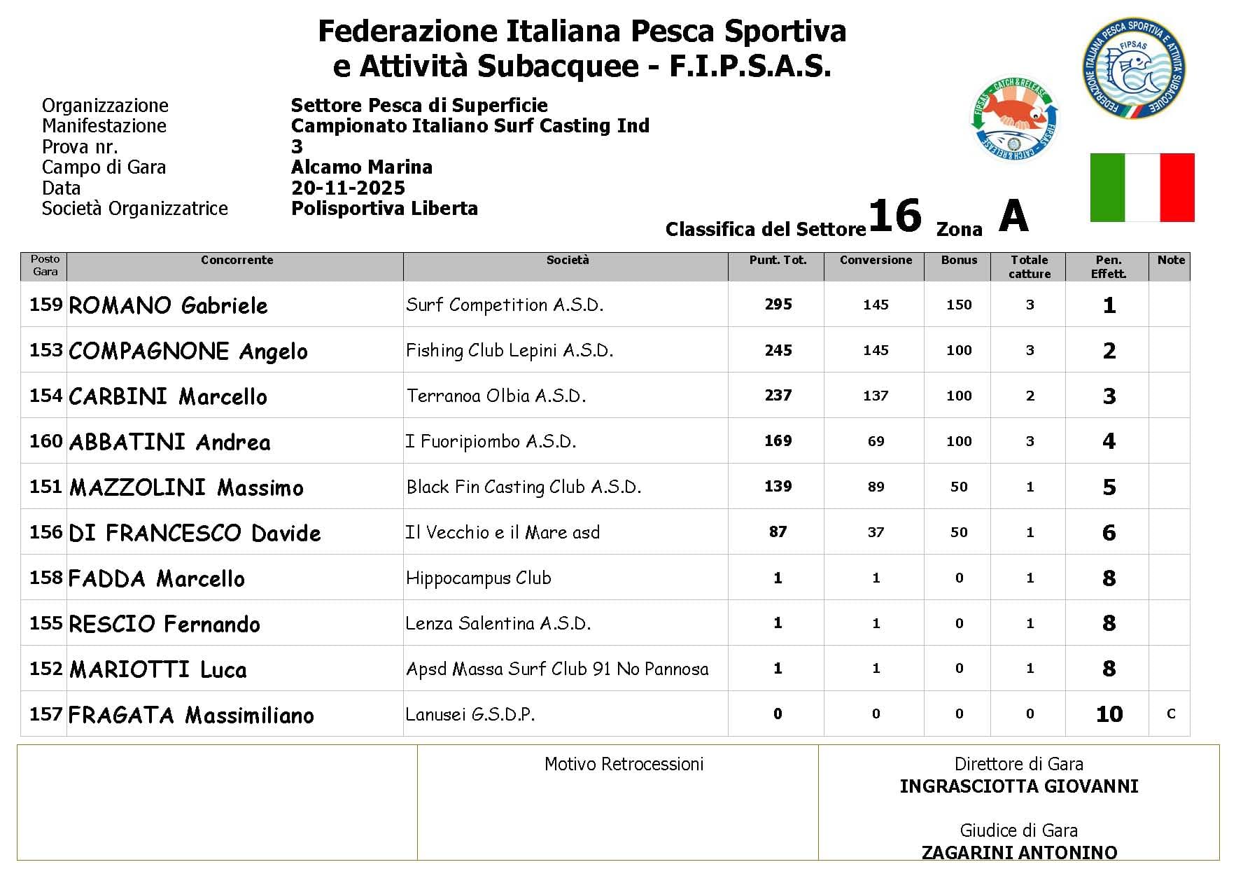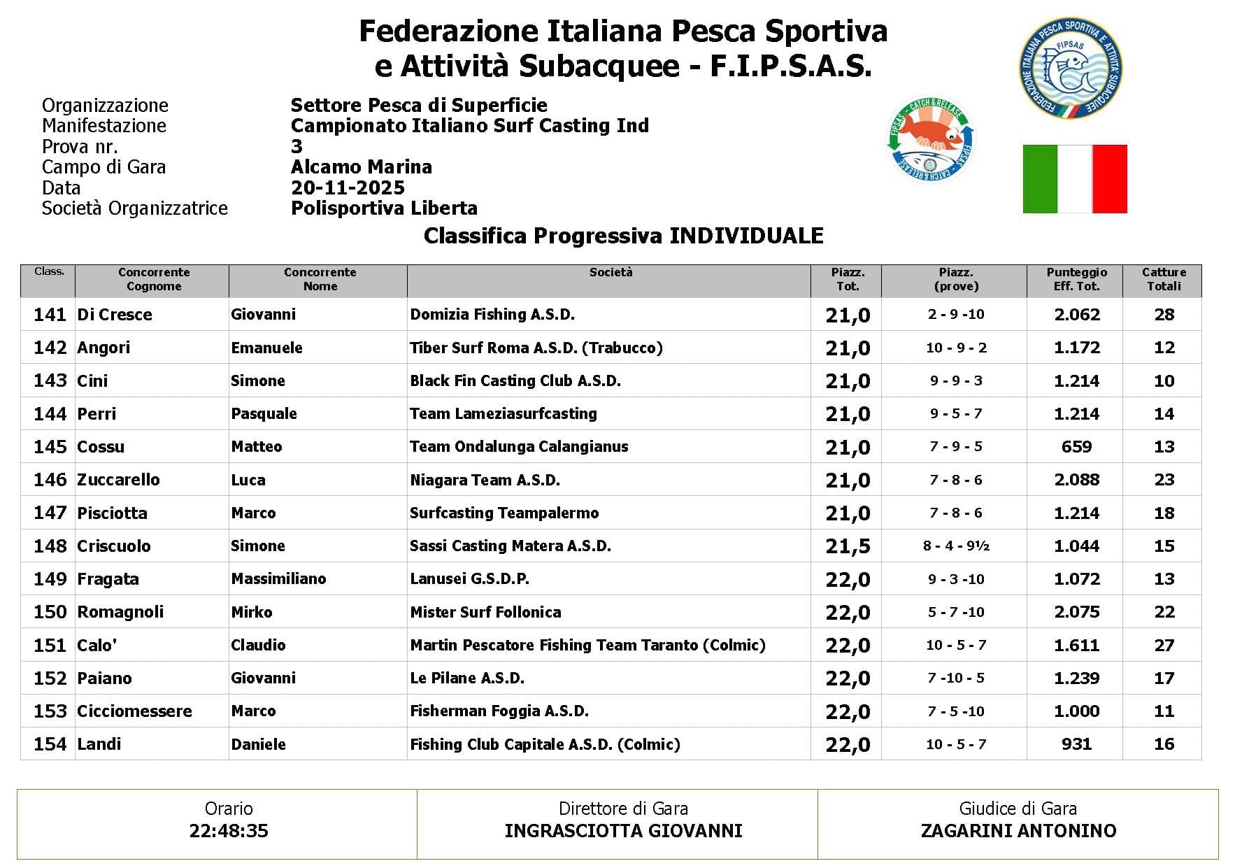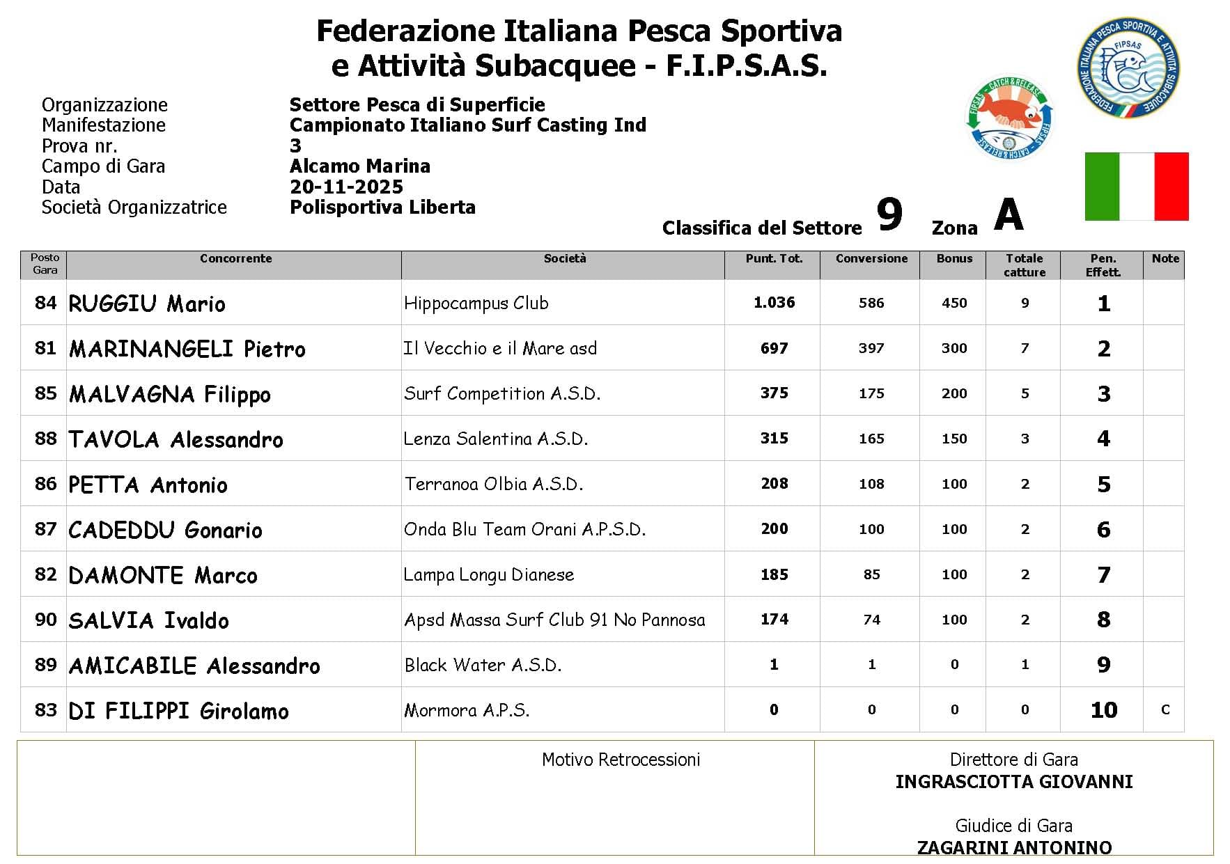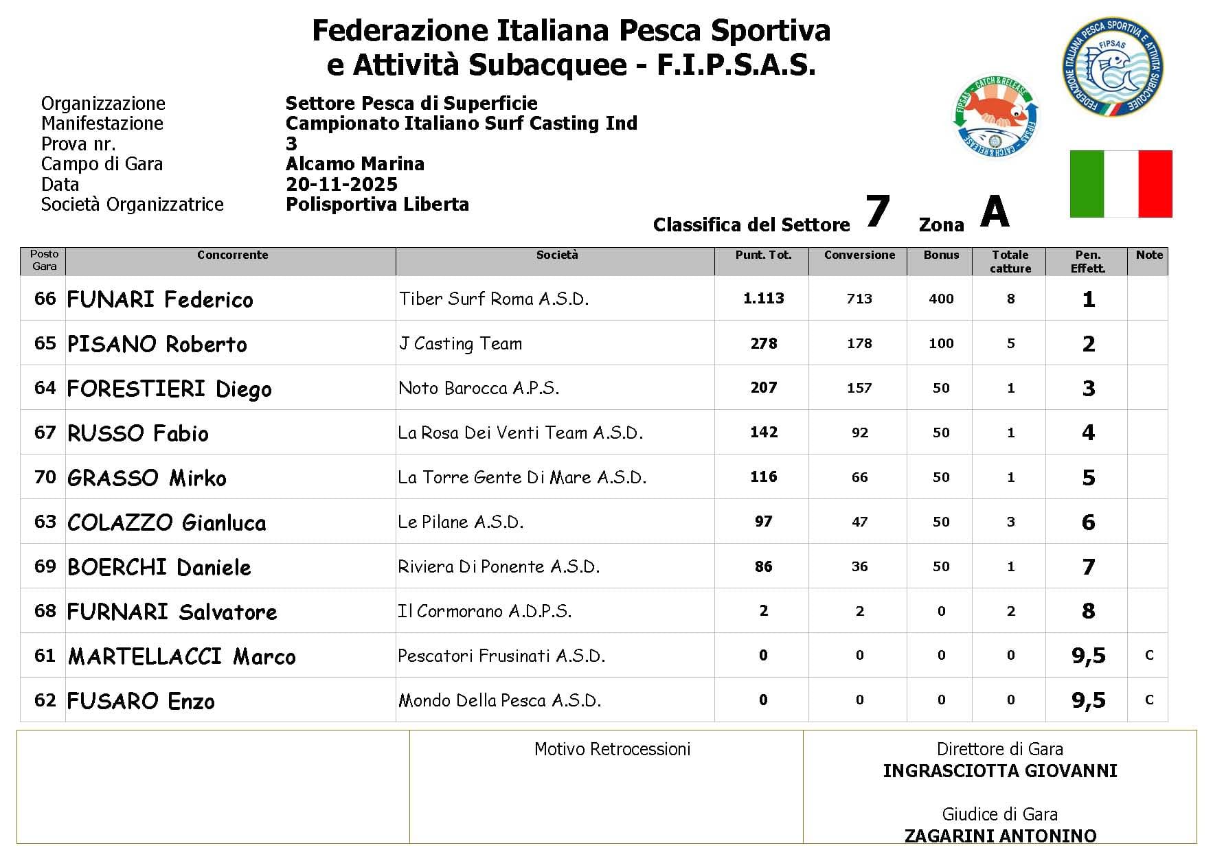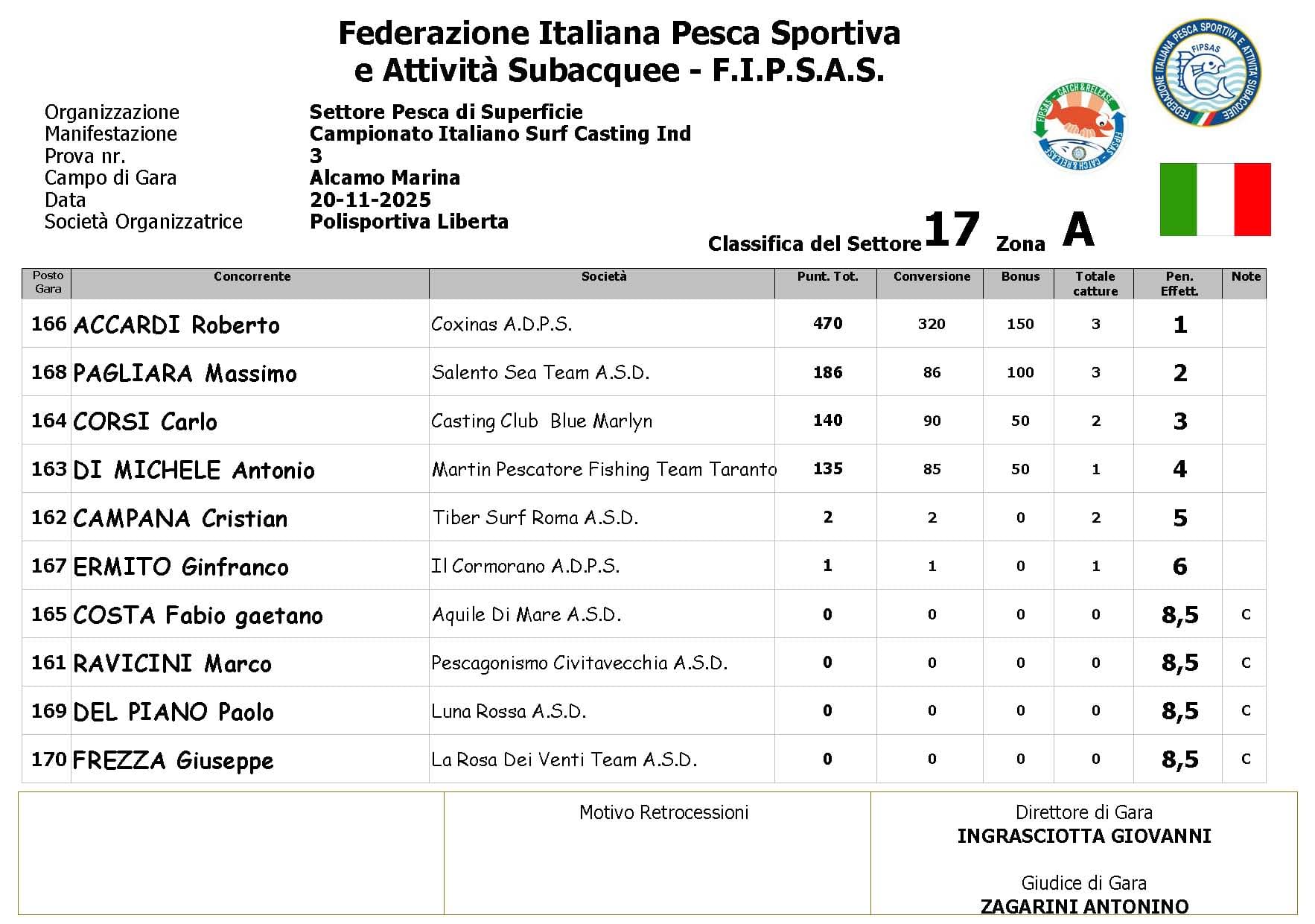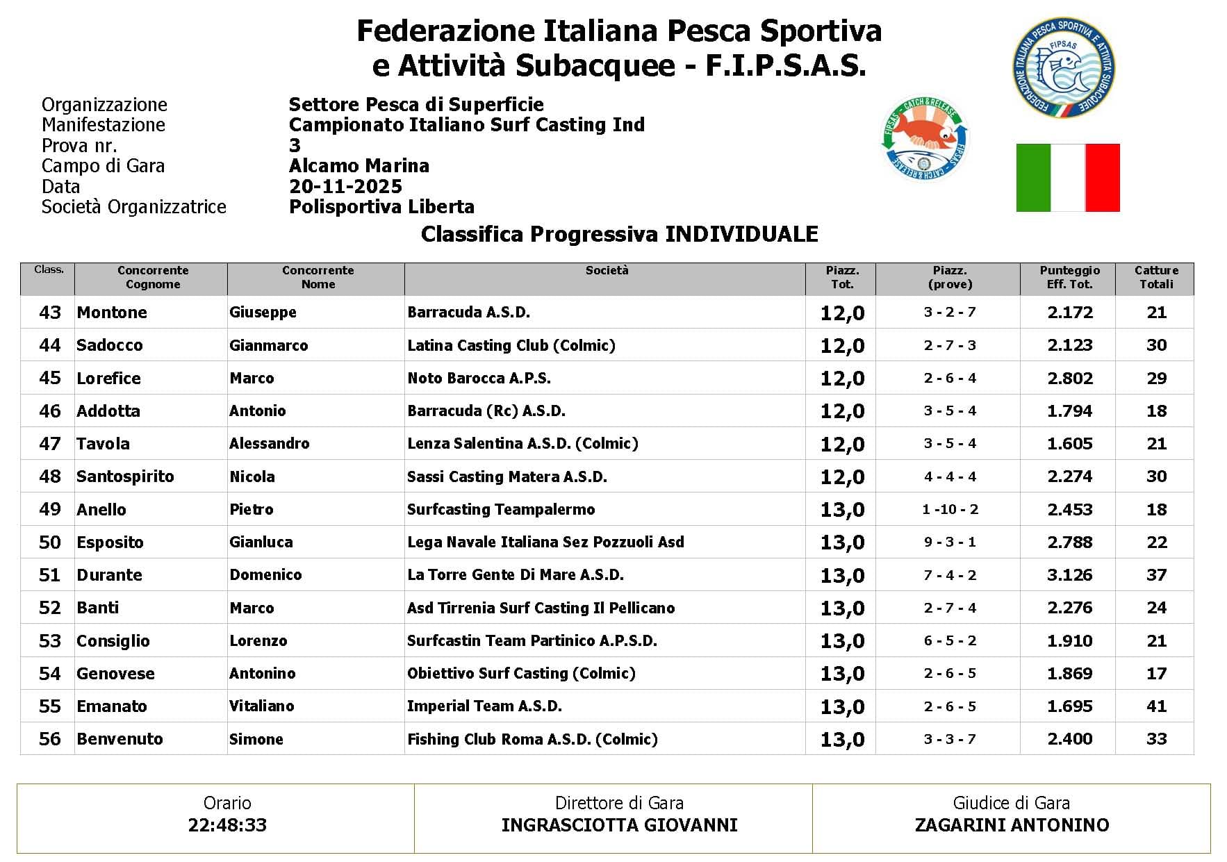 Si è conclusa anche la terza prova ,del Campionato Italiano di Surf Casting ad Alcamo Marina, una prova segnata dal netto peggioramento delle condizioni meteo rispetto alla giornata precedente. Come ampiamente previsto, un vento insistente ha iniziato a sollevare onde già prima del via, mentre una pioggia intensa ha accompagnato quasi tutta la prima ora di gara, mettendo subito alla prova concentrazione e tecnica dei partecipanti.