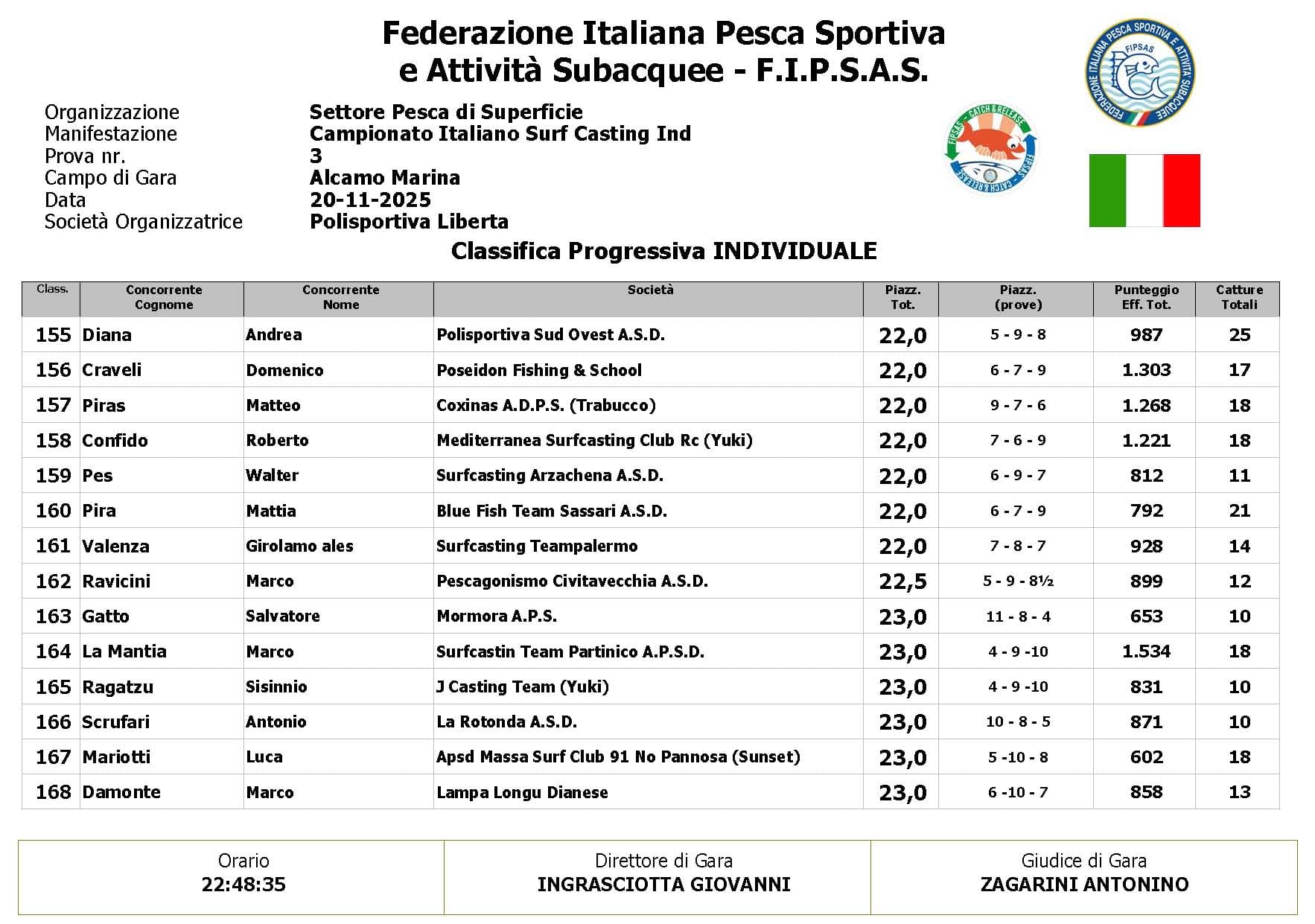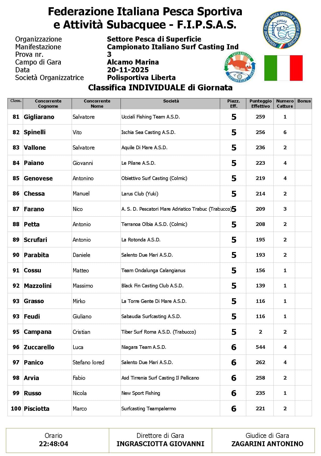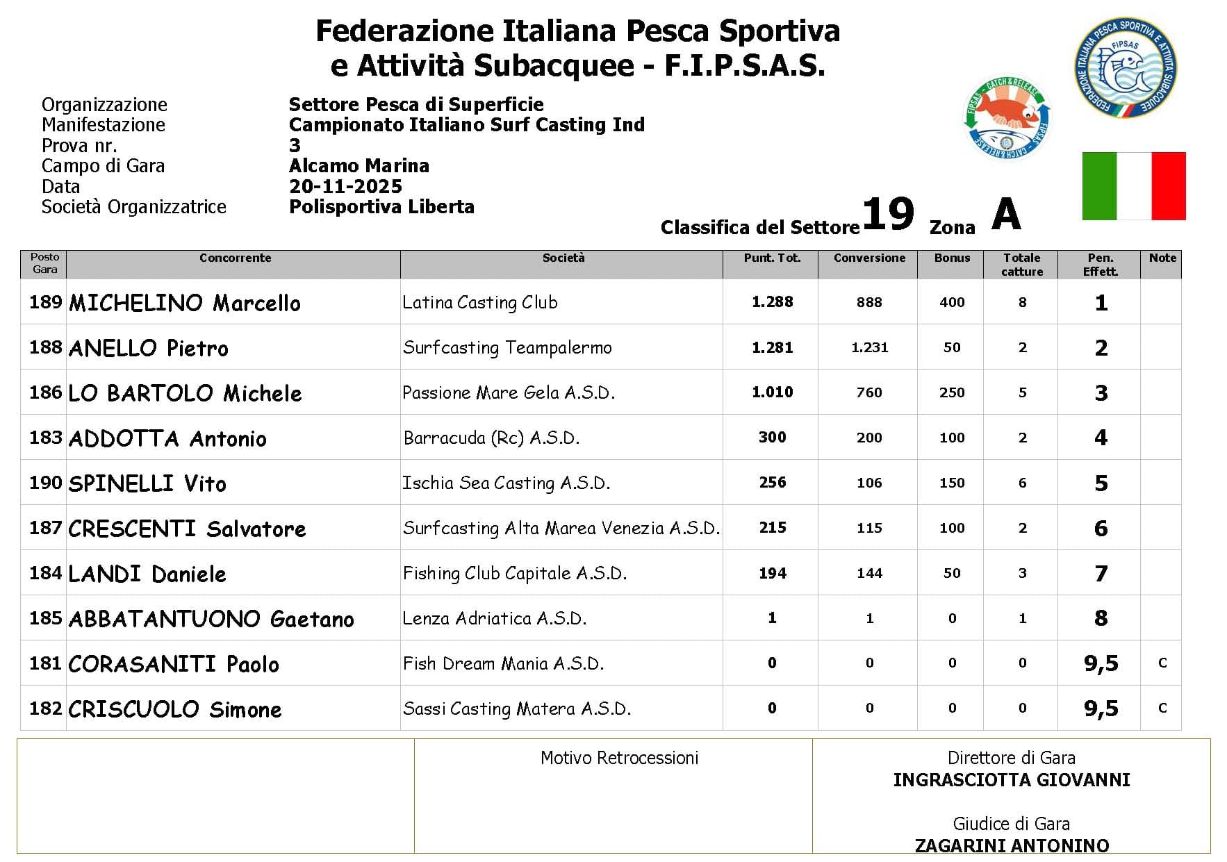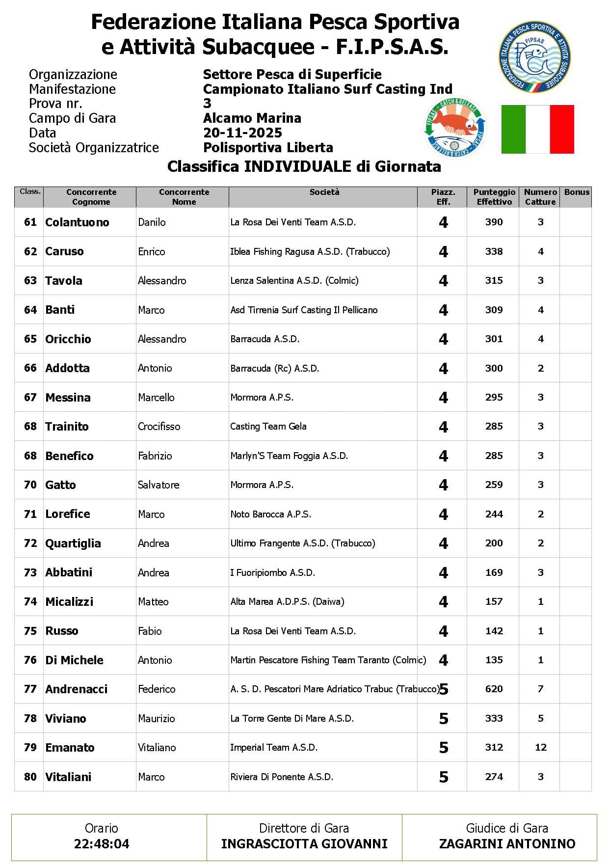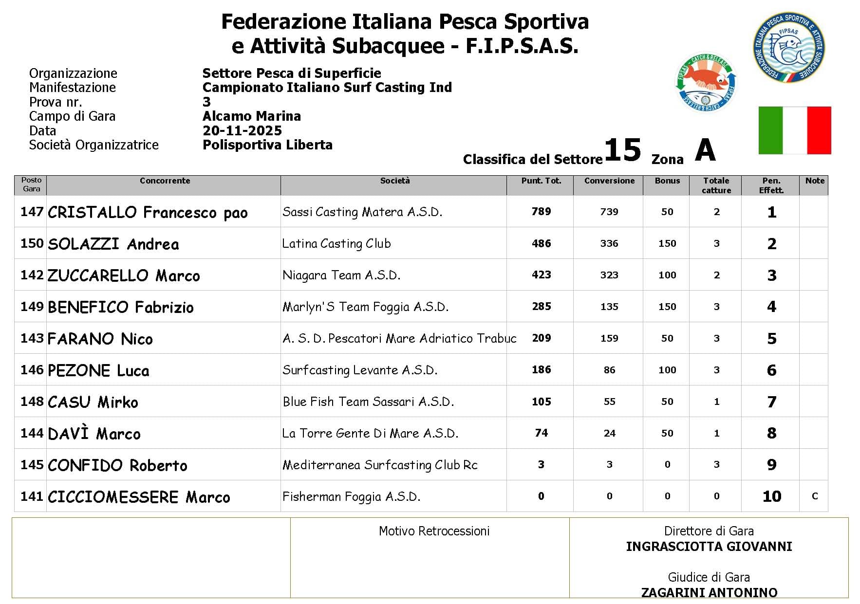 Si è conclusa anche la terza prova ,del Campionato Italiano di Surf Casting ad Alcamo Marina, una prova segnata dal netto peggioramento delle condizioni meteo rispetto alla giornata precedente. Come ampiamente previsto, un vento insistente ha iniziato a sollevare onde già prima del via, mentre una pioggia intensa ha accompagnato quasi tutta la prima ora di gara, mettendo subito alla prova concentrazione e tecnica dei partecipanti.