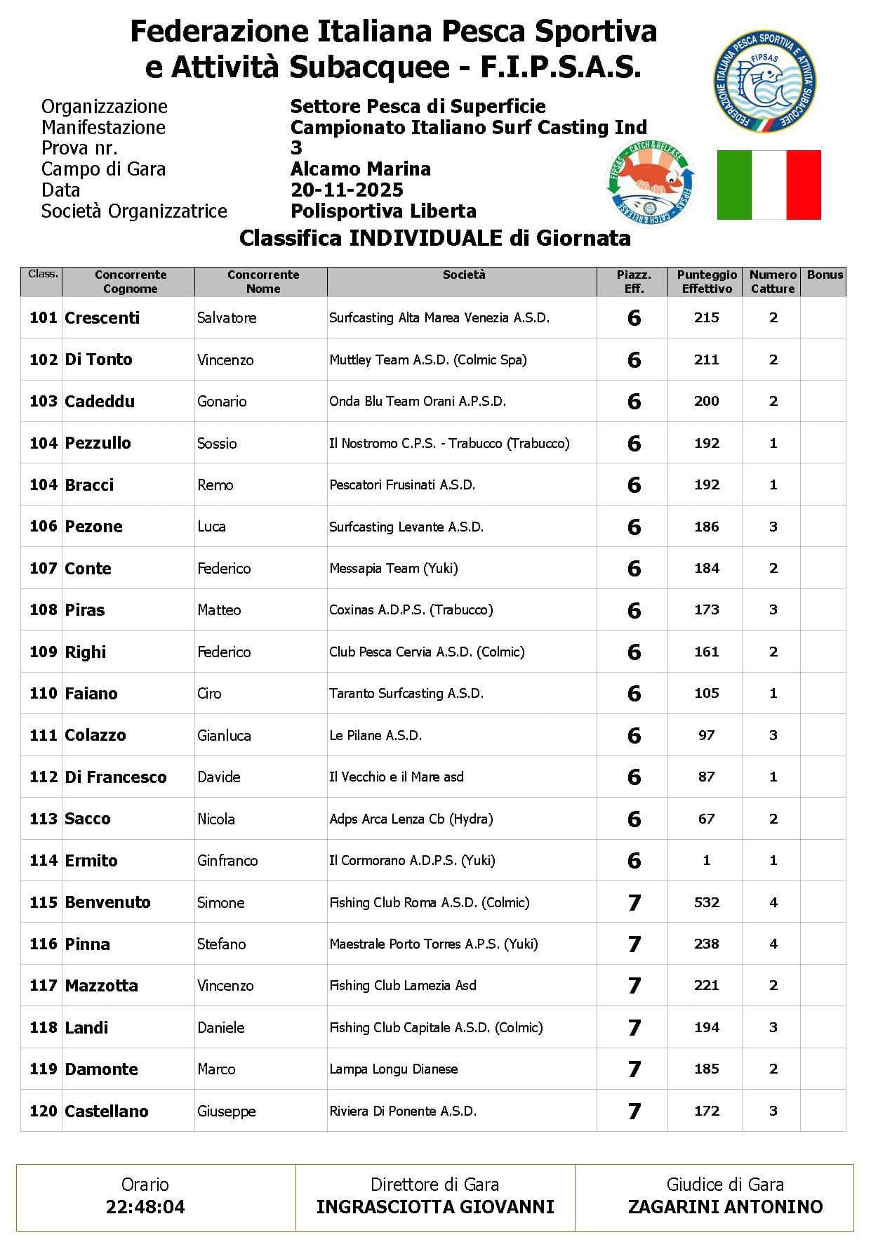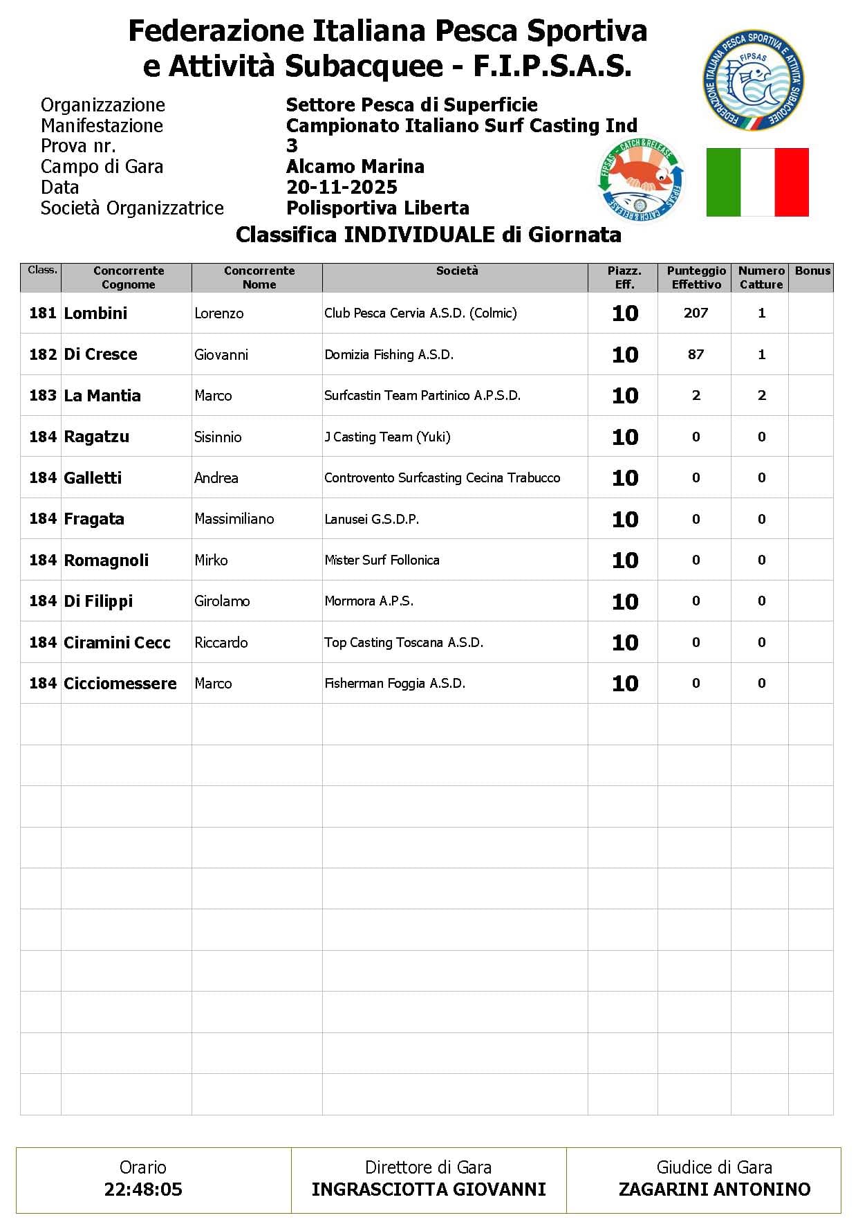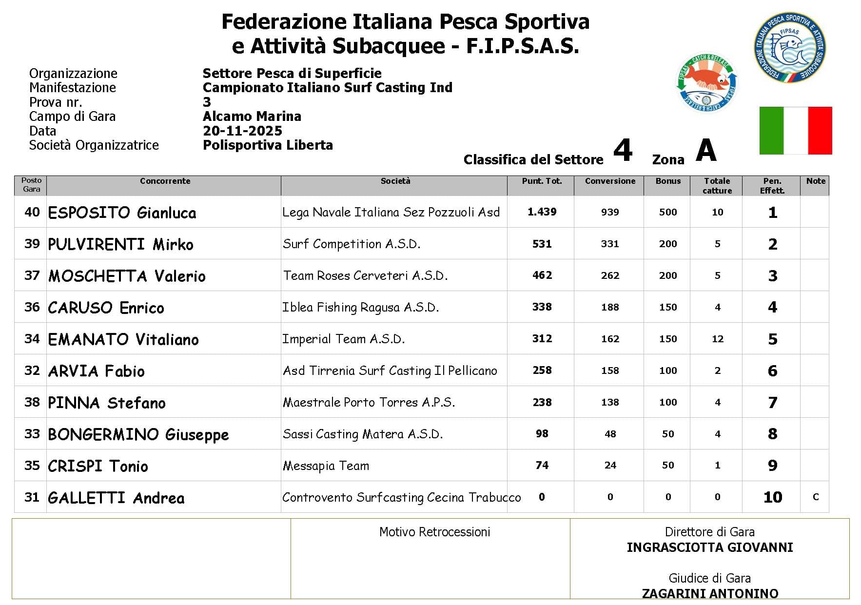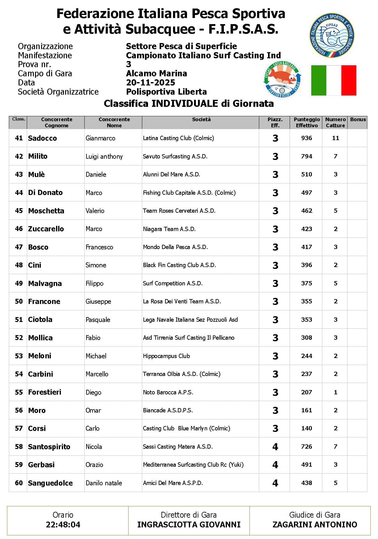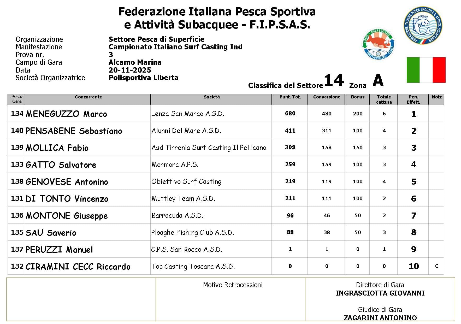 Si è conclusa anche la terza prova ,del Campionato Italiano di Surf Casting ad Alcamo Marina, una prova segnata dal netto peggioramento delle condizioni meteo rispetto alla giornata precedente. Come ampiamente previsto, un vento insistente ha iniziato a sollevare onde già prima del via, mentre una pioggia intensa ha accompagnato quasi tutta la prima ora di gara, mettendo subito alla prova concentrazione e tecnica dei partecipanti.