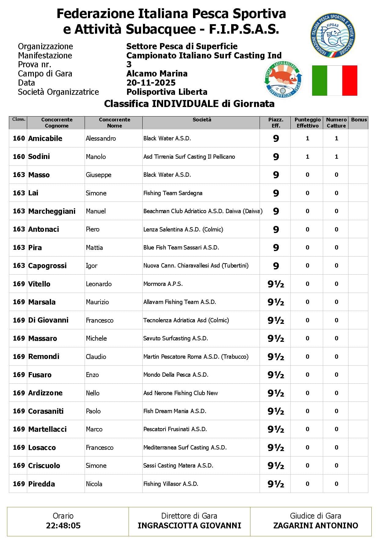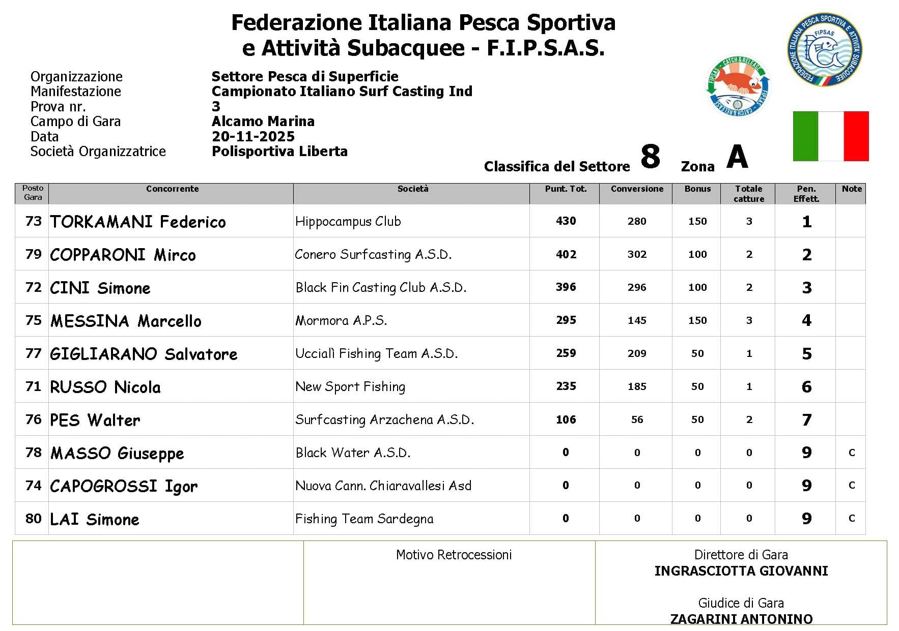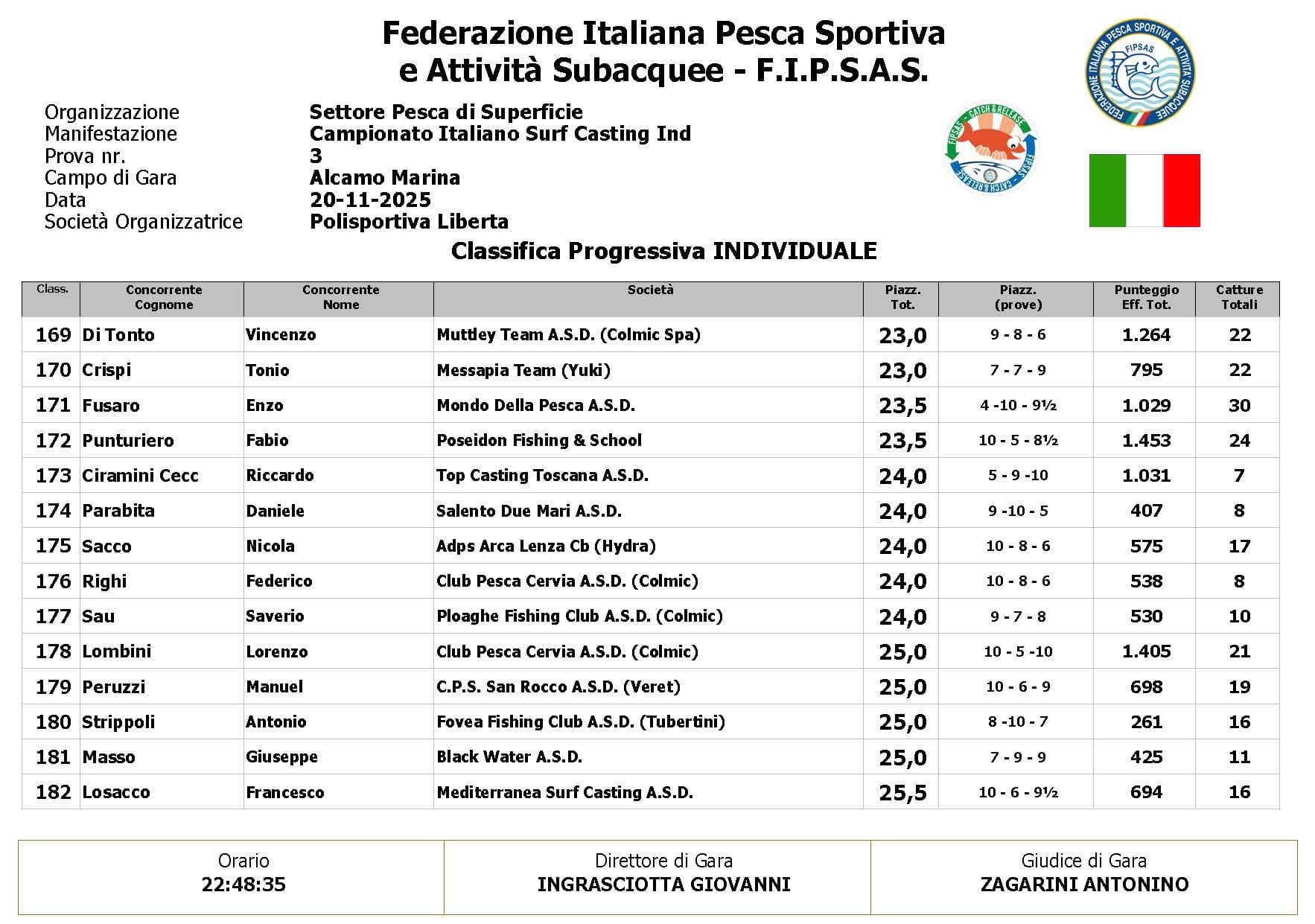 Con il passare del tempo, però, la situazione è cambiata: il moto ondoso irregolare e il continuo disturbo meteorologico hanno reso sempre più difficile individuare nuove catture. Col procedere della gara il numero dei pesci è progressivamente calato, influenzando in modo evidente l’andamento della classifica.