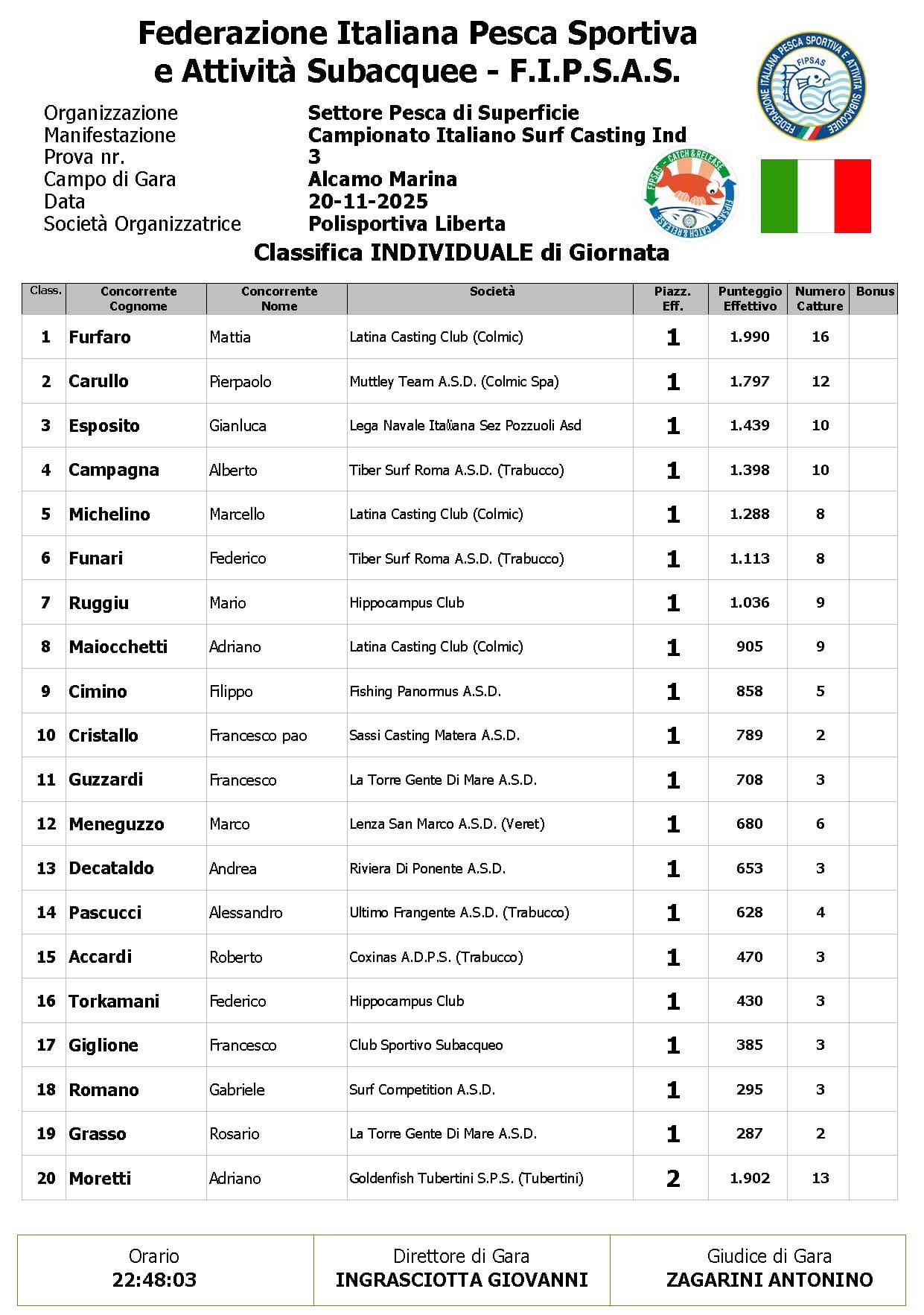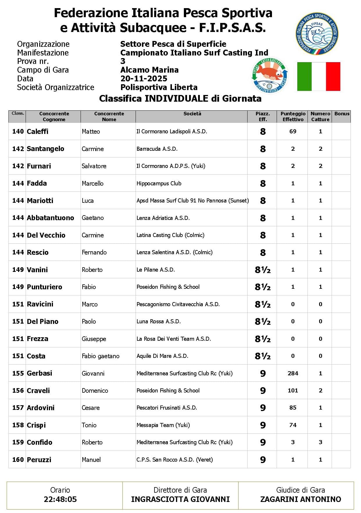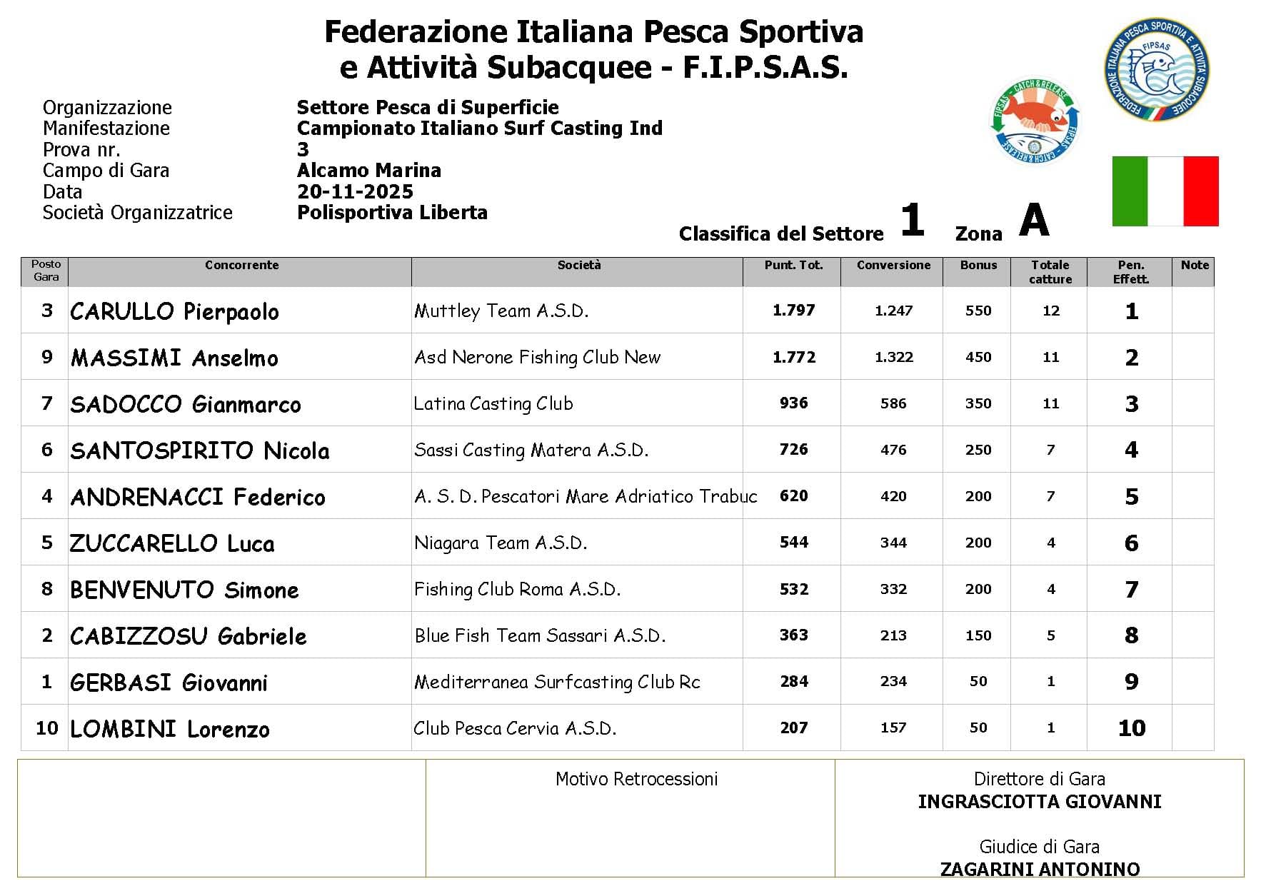 Con il passare del tempo, però, la situazione è cambiata: il moto ondoso irregolare e il continuo disturbo meteorologico hanno reso sempre più difficile individuare nuove catture. Col procedere della gara il numero dei pesci è progressivamente calato, influenzando in modo evidente l’andamento della classifica.