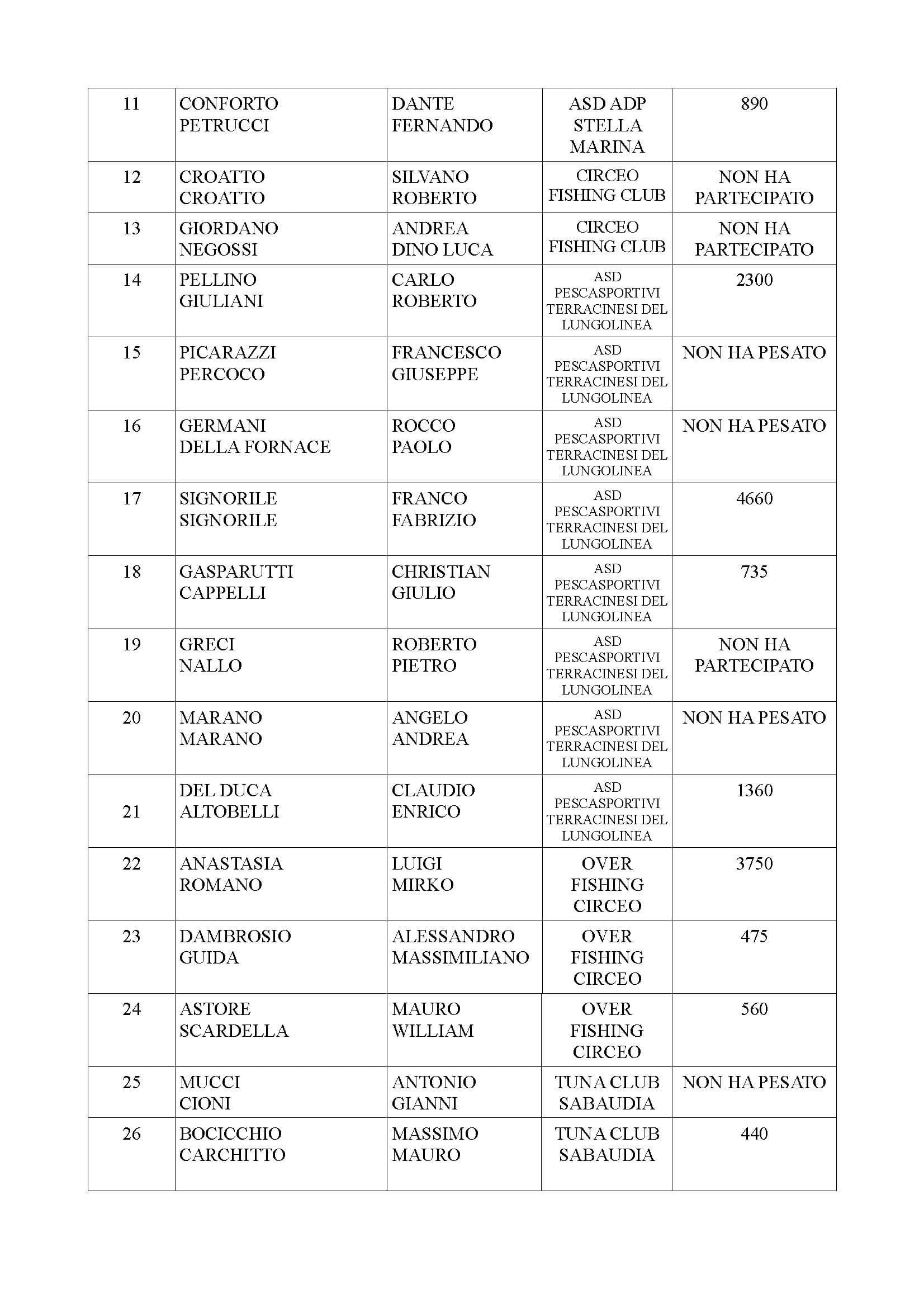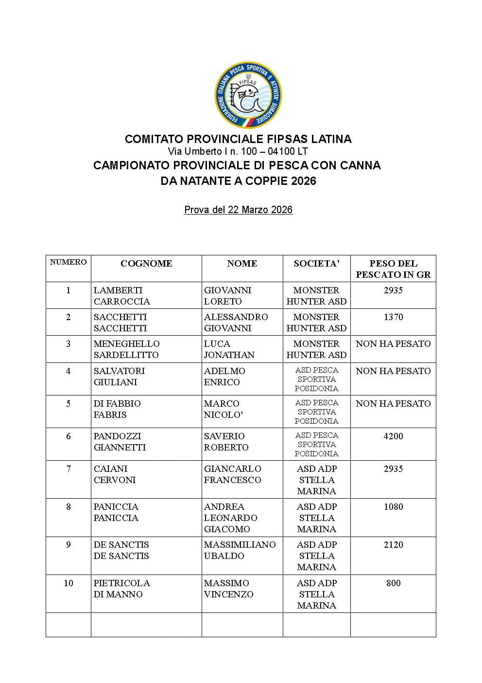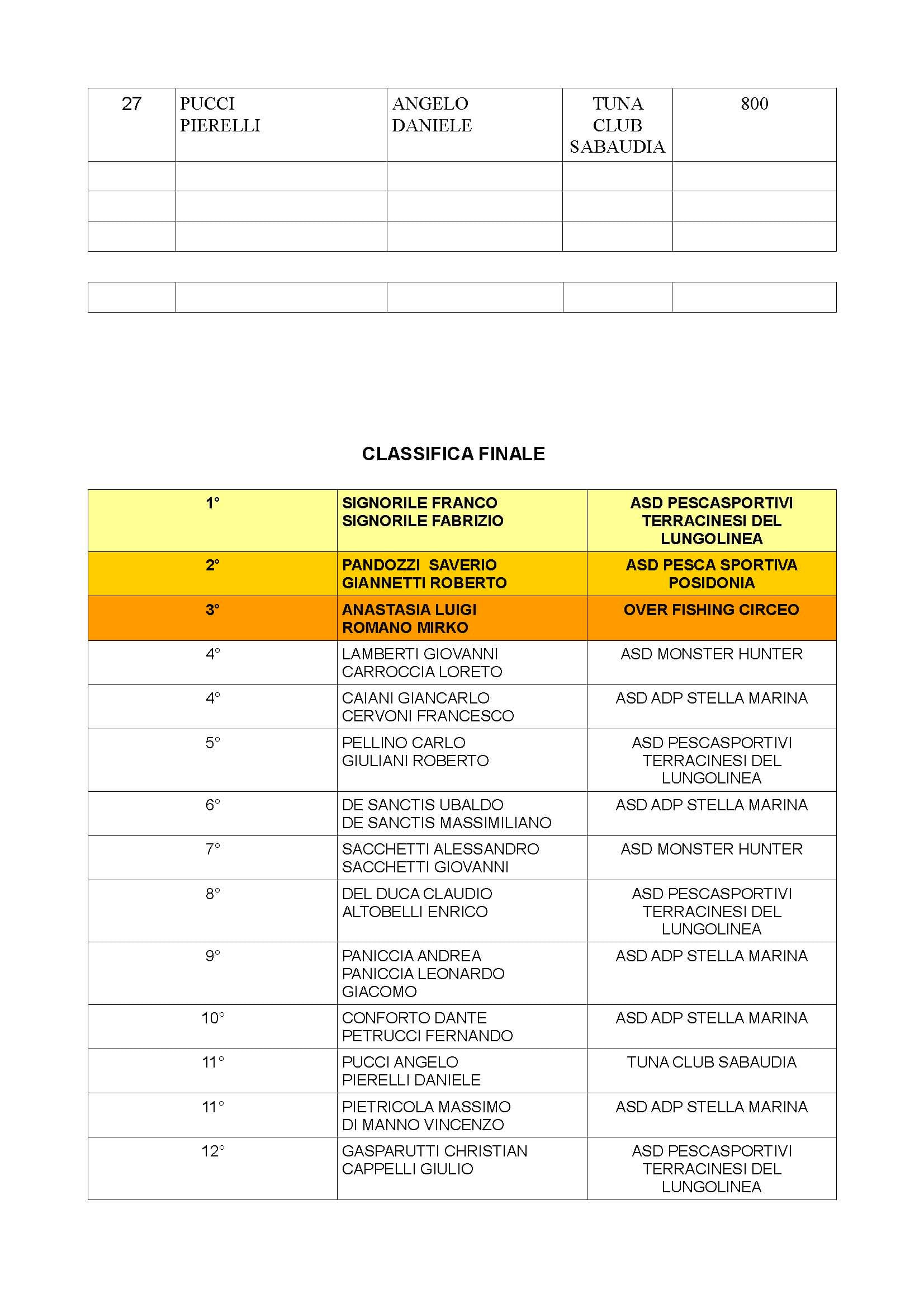 Nella finale di Terracina, disputata il 22 marzo, 27 equipaggi iscritti, hanno cercato la vittoria di un atipico Campionato provinciale di canna di natante a coppie, chiusosi, alla fine, in una sola manche. Ha prevalso su tutti il team dei fratelli Franco e Fabrizio Signorile (Asd Pescasportivi Terracinesi del Lungolinea), seguiti da Saverio Pandori e Roberto Giannetti (Asd Pescasportiva Posidonia) e Luigi Anastasia e Mirko Romano (Over Fishing Circeo) a completare il podio.