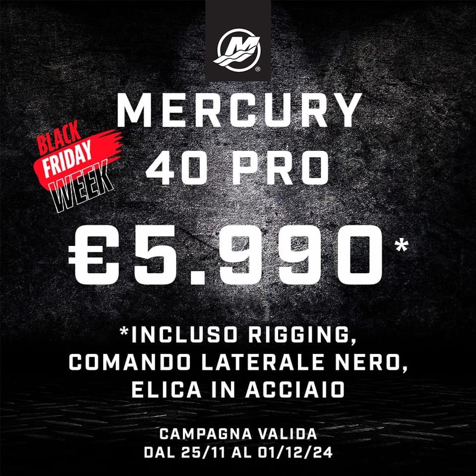 Solo fino al 9 dicembre! I favolosi Black Friday di Cortis vi aspettano. Non perdete l'occasione: 6 imbarcazioni a prezzi stracciati. E per i più veloci, fino al 1 dicembre, il Mercury 40 Pro, incluso rigging, comando laterale nero e elica in acciaio a soli € 5.990. Inoltre, sconti anche per l'elettrico.