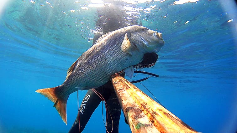 Quali nuovi spot hai frequentato? Tra i tanti, la secca della Pagliosa, oltre capo Marrargiu, distante solo 300 metri dall’omonimo isolotto, distante anche lui solo 300 metri dalla costa. La secca ha il cappello a 12 metri, e i versanti cadono fino a 30. La roccia è bianca, simile alla secca di Capo Marrargiu. La prima volta che l’ho battuta ho trovato i delfini che sono riuscito a filmare, prima dal gommone e poi sotto l’acqua. Verso sud, invece, la secca di Corona Niedda, a circa 5 miglia dal porto, dove ho iniziato a prendere le prime cernie grosse e lecce. Il cappello è a 15 metri e va giù fino a 29 metri, su sabbia. Praticamente un panettone ricoperto da posidonia con saraghi, gronghi e murene. È qui che sono cresciuto tecnicamente, “specializzandomi” nella tecnica dell’aspetto, per dentici, orate e pesci di branco, tuttora la mia preferita.