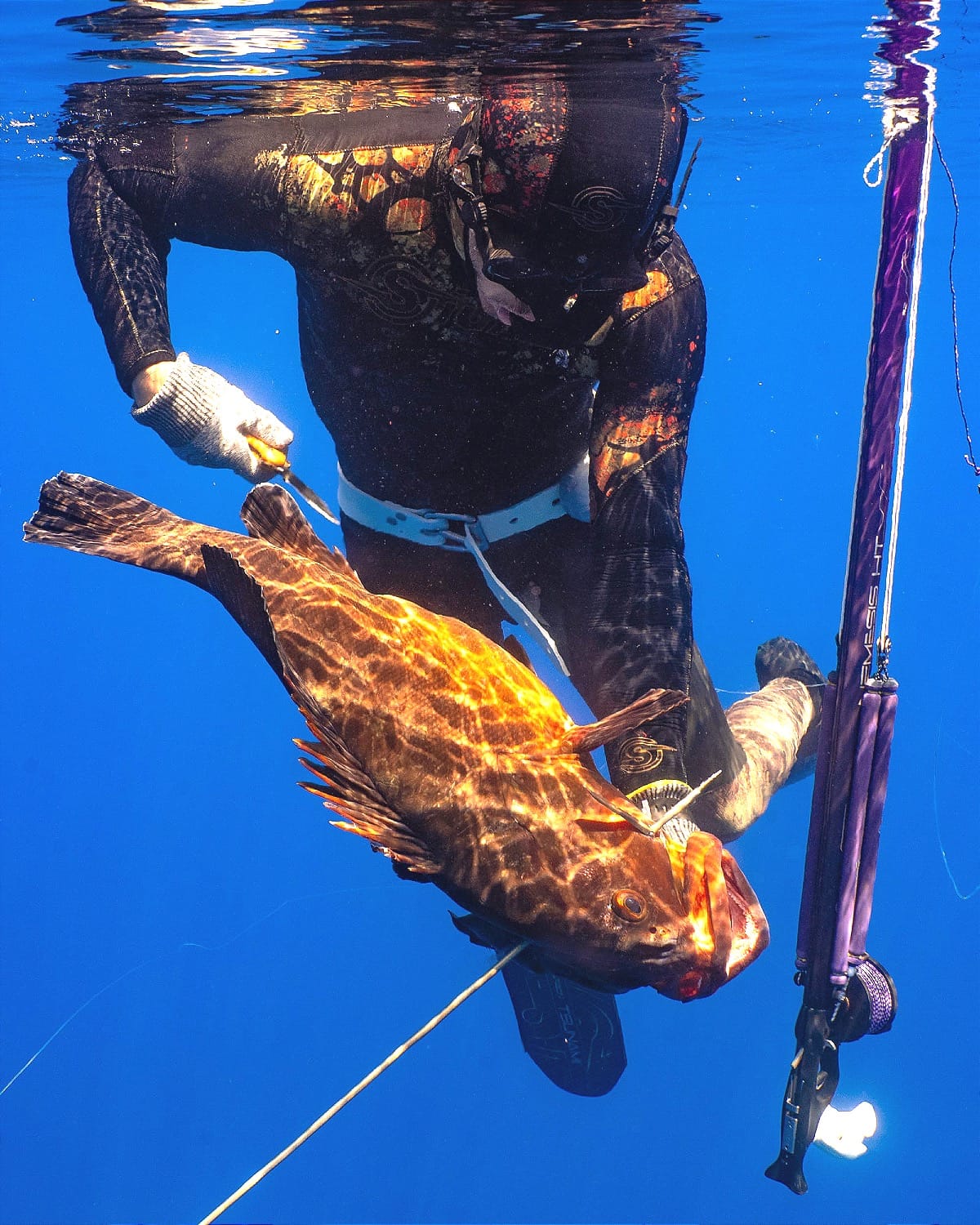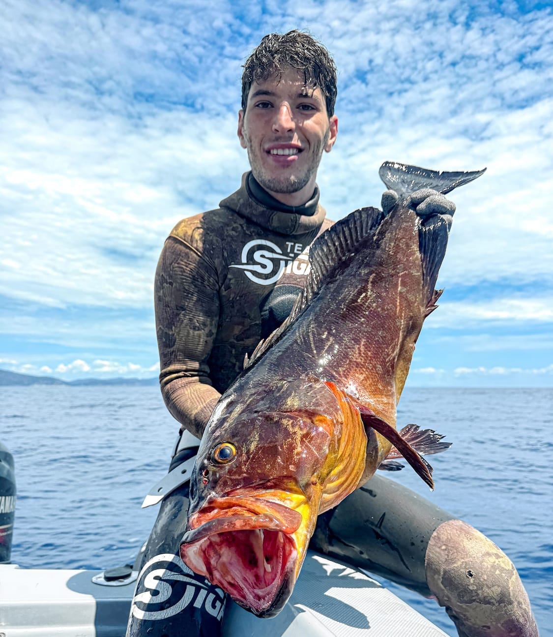 Una bella cernia bruna pescata sui fondali dell’isola d’Elba. Il dentice, un pesce che normalmente Davide pesca all’aspetto, ma la sua tecnica preferita rimane senz’altro la tana.