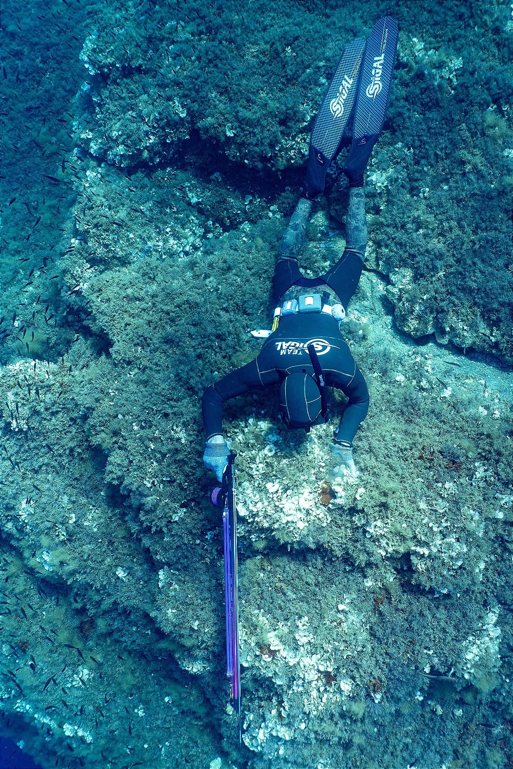 Poi a 16 anni? A 16 anni, mio babbo, atleta Omer, mi regala la mia prima attrezzatura per la pesca subacquea: maschera, pinne, muta e fucile. Io non sta- vo nella pelle, ero felicissimo e soprattutto sempre in mare. Ma mia mamma frenava, cercava di contenere questo entusiasmo… cercava, appunto. Del resto dalla mia avevo il babbo, lo zio e pure i loro amici.