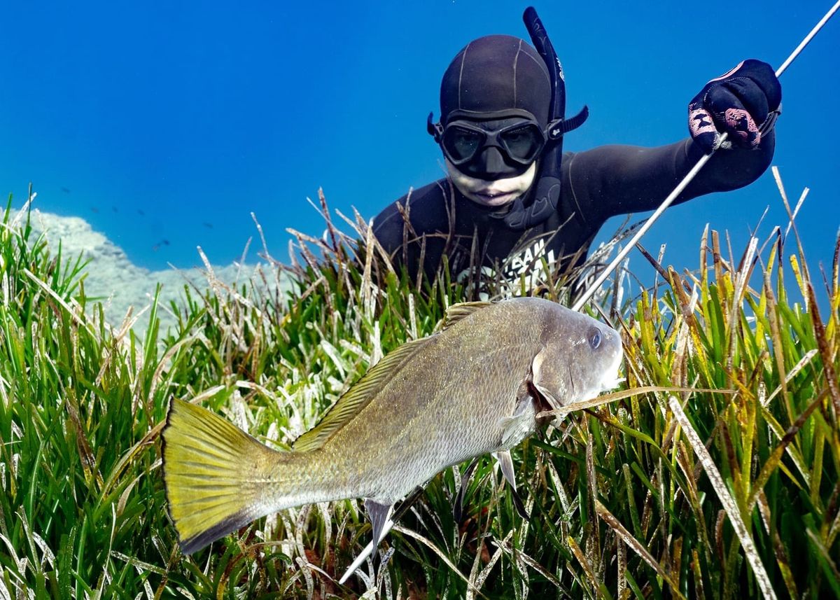 foto in alto: Davide, in caccia nella prateria a posidonia, infilza una bella corvina.