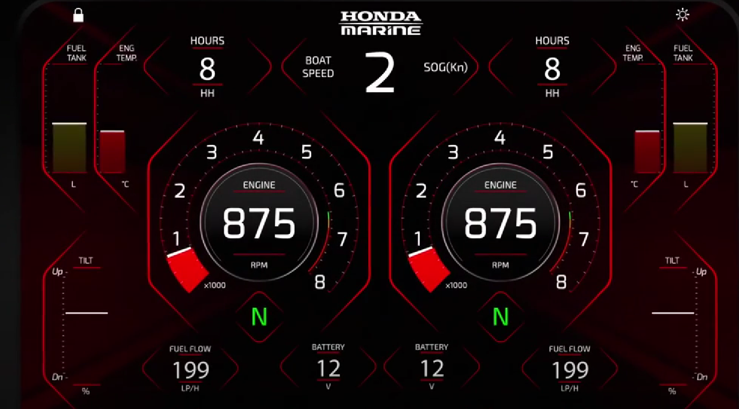 Lo schermo è da ben 7 pollici, con un angolo di visualizzazione utile di 85°, è dotato della funzione ECOmo e si può visualizzare il setup motore singolo o doppio. Stiamo parlando del display multifunzione che Honda ha ideato espressamente per l’utilizzo dei motori fuoribordo che supportano la rete NMEA2000 e quindi i modelli delle serie da BF40 a BF350. È dotato di schermo touch screen, ben leggibile alla luce del sole, grazie alla luminosità di 1000 nit (unità di misura della brillanza, dove 1 nit è pari a una candela a metro quadro). In dotazione viene fornita un'antenna Gps esterna, necessaria per la rilevazione della velocità e della direzione. Questo multifunzione Honda si configura automaticamente per visualizzare le informazioni di un massimo di due motori. È presente una bussola digitale e un timer per agevolare la navigazione; può controllare un'unità di commutazione digitale a 6 canali e un'unità audio collegate alla rete NMEA 2000.