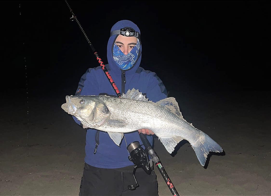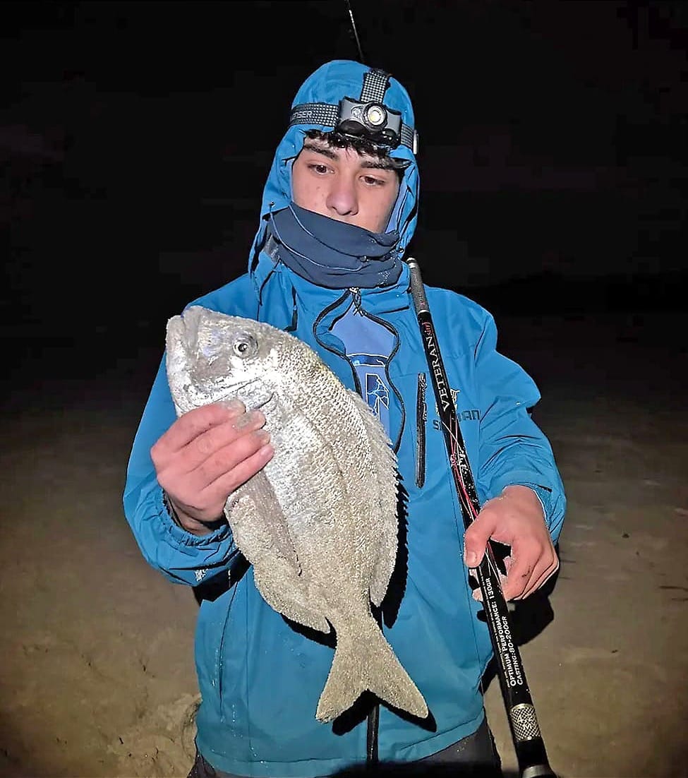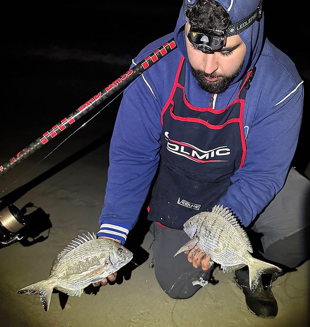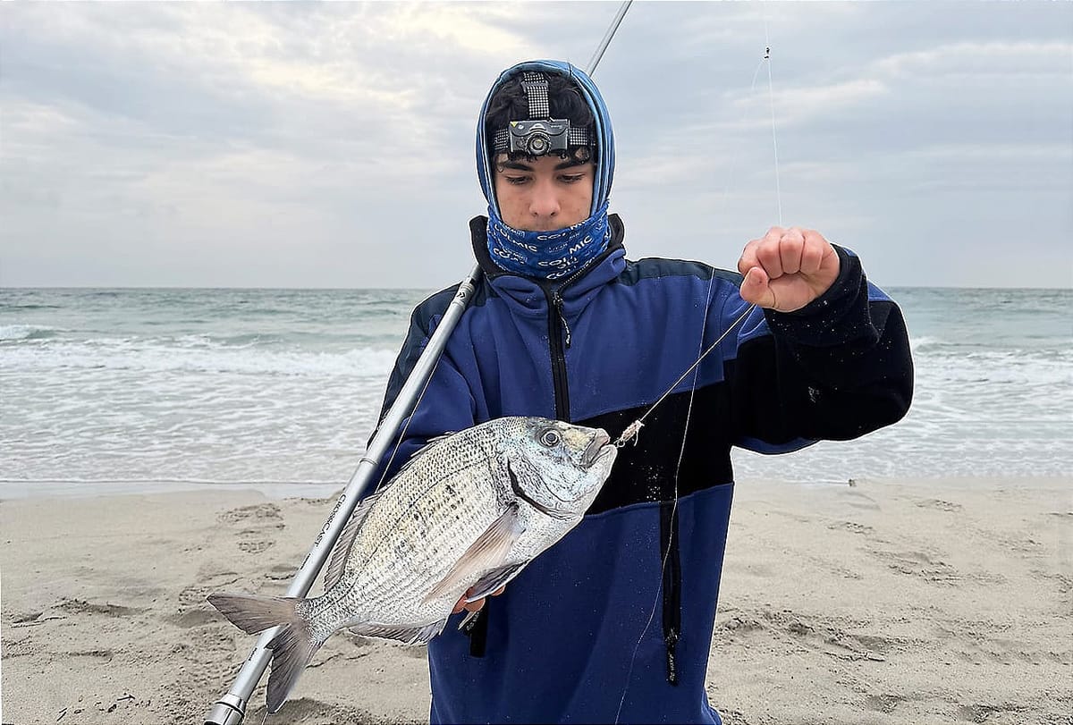 Il mare non era in scaduta. Non c’era quel momento “magico” che tutti aspettano. Era una fase costante, onde regolari, schiuma continua, corrente sostenuta ma stabile. Molti avrebbero rimandato. Noi no! Perché certe battute non si fanno solo per il pesce. Si fanno per condividerle. Imparare ad affrontare il mare. Infatti, in queste condizioni, quando ancora la vera scaduta non è iniziata, le catture sono davvero difficili e il mare non ti regala niente. Devi “lavorare” ogni metro di spiaggia. Con mio fratello Gabriele abbiamo studiato la battigia con calma. La schiuma era uniforme, ma tra un frangente e l’altro si intravedevano leggere depressioni: piccoli canaloni nascosti. È lì che abbiamo deciso di pescare. Terminali semplici, puliti. Esche presentate con cura. In condizioni così il dettaglio conta più della distanza. Dopo quasi un’ora arriva la prima risposta: una mangiata secca, nervosa che mette la canna in bando a favore di corrente. Ferrata e combattimento con la preda che da subito tenta una fuga laterale, comportamento tipico del sarago. Si tratta della prima delle tante coppiole della nottata. Color argento vivo sotto la lampada, pinne tese, forza sorprendente per la sua taglia, ed ecco che escono i primi due saraghi.