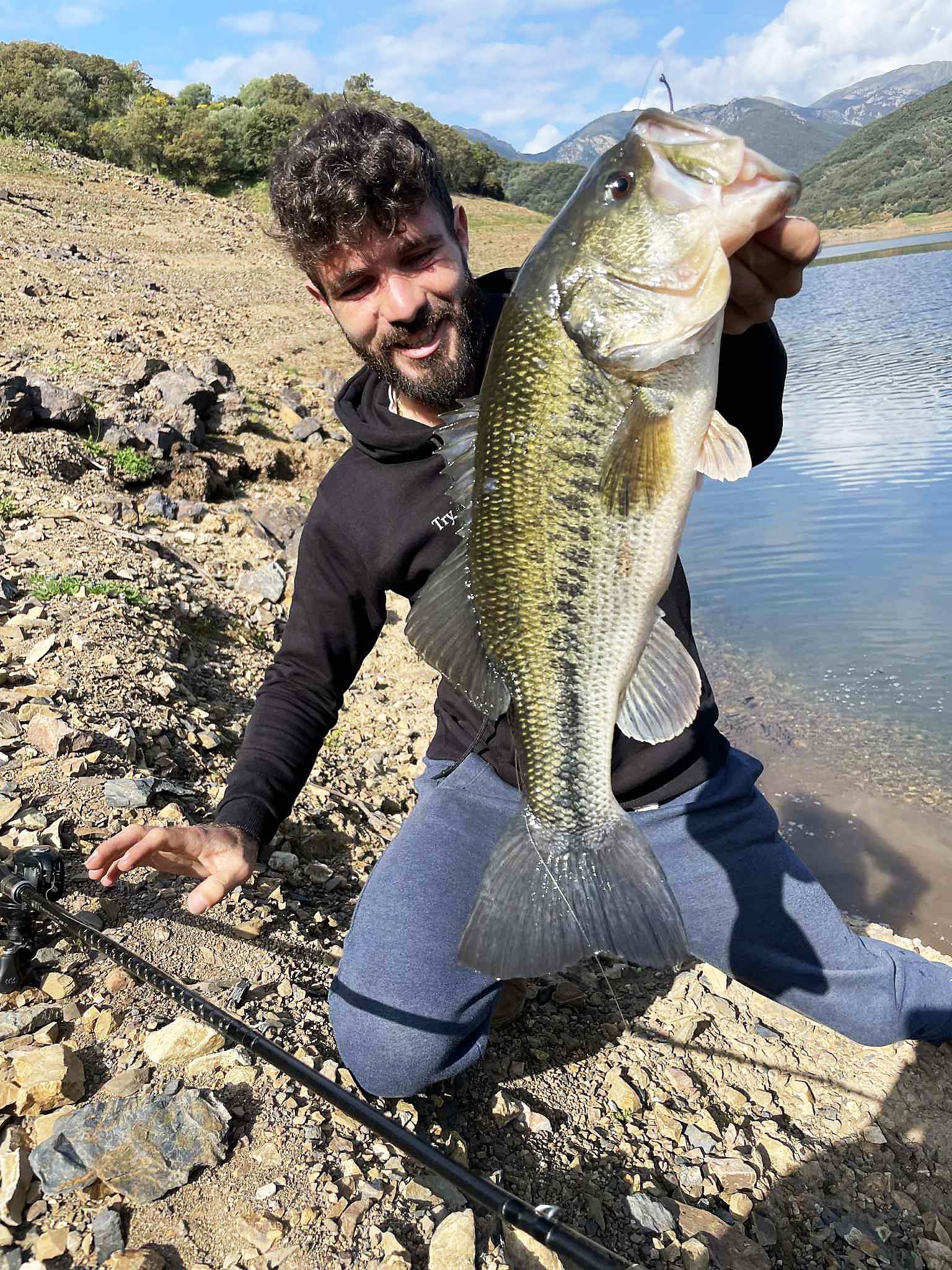Rara immagine di un bass nel suo ambiente naturale e Andrea Palmas che sostiene visibilmente soddisfatto un grosso bass catturato sulle rive di un lago.