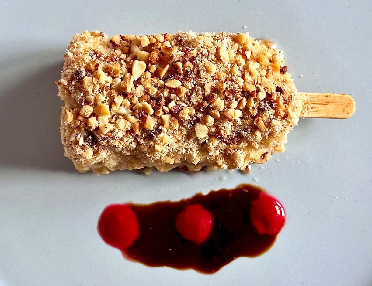 Filetto di sampietro in crosta di nocciole con coulis di lamponi e riduzione di aceto balsamico.