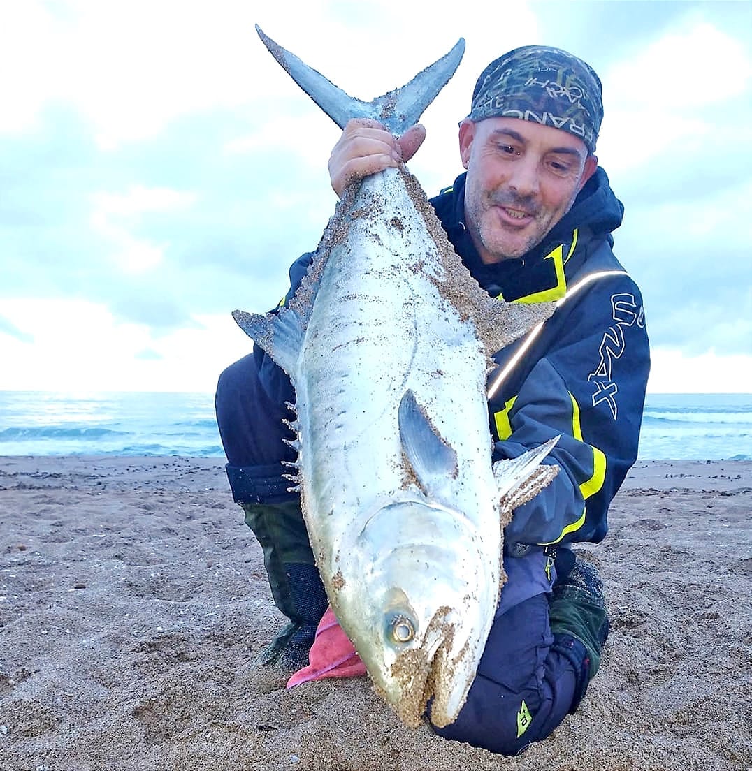 E si, perché quello che poteva sembrare un racconto romanzato è invece testimonianza di due esperti pescatori che in due spiagge diverse, in giorni diversi, ma con le stesse ambizioni, hanno deciso di sfruttare la montata (uno di scirocco, l’altro di libeccio) per insidiare, con precisione chirurgica, due predatori molto poco comuni nei carnieri del surfcasting: lampuga e leccia amia. Andrea Galiani le ha viste le lampughe la sera prima, cacciavano a non più di 40 metri da riva, stupende, coloratissime, inconfondibili. Faceva un caldo inconsueto, tanto che Andrea si muoveva tra le canne in maglietta. Poi freddo di notte e di nuovo caldo dopo l’alba. Ma proprio questa anomalia gli ha messo in testa un’idea pazza: “Domani mattina pesco una lampuga!”. Ha aspettato un’intera notte, la lampuga non caccia col buio. E infatti solo dopo l’alba, finalmente ha visto l’attacco, con una partenza portentosa, instancabile. Nell’altro versante dell’isola, Emanuele Orrù aveva programmato la notte di pesca ben conscio che l’alba gli poteva regalare l’incontro con la leccia amia. “All’alba la pesco, all’alba la pesco!”. Stessa esca, ma condizioni di mare differenti, con l’acqua più fredda e tanta corrente. La leccia si è mostrata in tutta la sua maestosità, 7 chili di pura potenza. Due catture non comuni, ma non casuali, almeno per i veri lupi di mare.