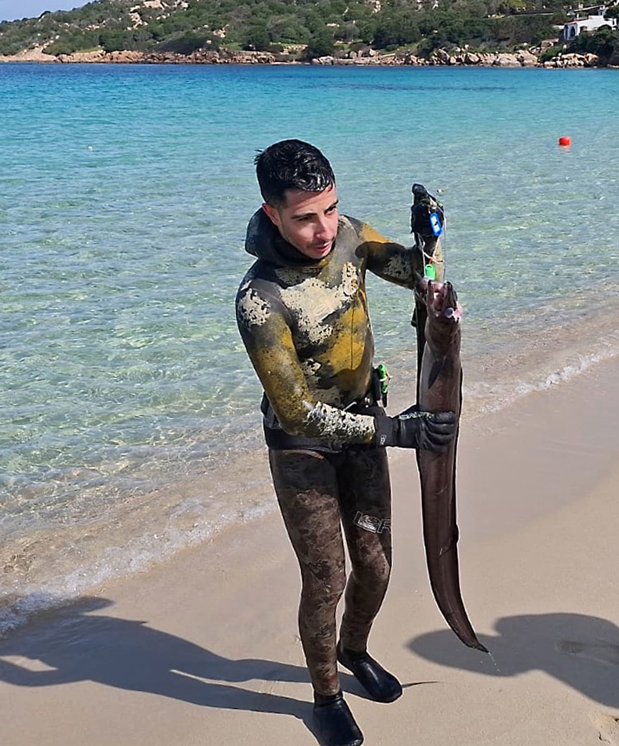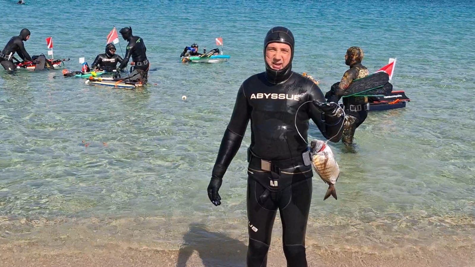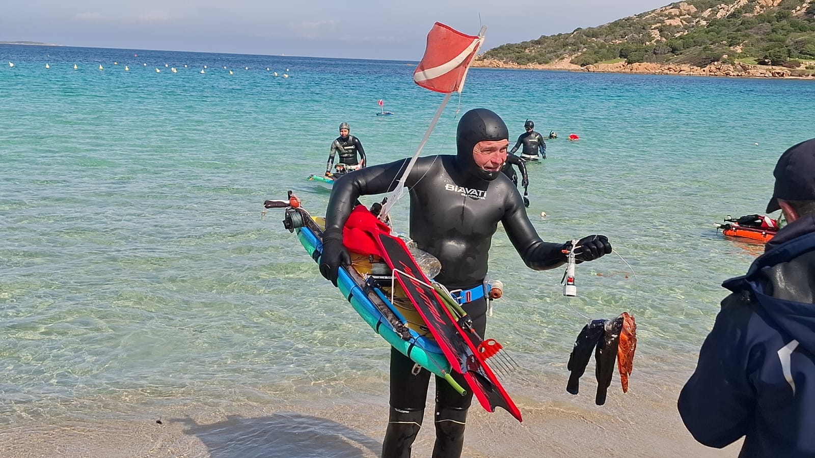 foto sopra: Sergio Oggiano, veterano e mai domo, esce dall’acqua con il suo carniere, il più importante della giornata.