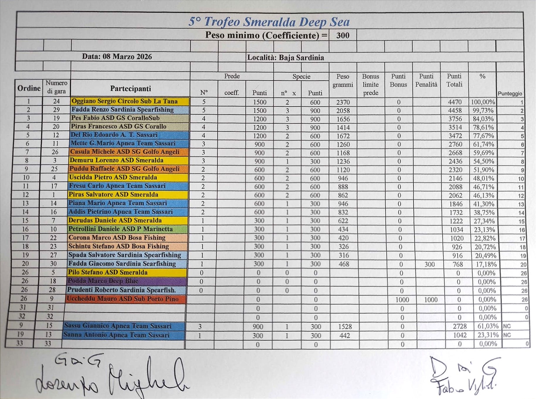 Tra un piatto e l’altro si analizzano le strategie di gara, si raccontano gli incontri più emozionanti e non mancano gli aneddoti legati alle catture più difficili. Ma l’atmosfera rilassata dura poco: la bilancia richiama rapidamente tutti all’ordine. Il giudice di gara Lorenzo Migheli dà il via alle operazioni di pesatura, accompagnate dal consueto entusiasmo del “one man show” Sergio Oggiano. La bilancia conferma le sensazioni della vigilia: trovare pesci validi non è stato semplice e per emergere è servita grande esperienza. A spuntarla è proprio Sergio Oggiano, che mette insieme cinque prede valide - quattro saraghi e un cappone - per un totale di 4470 punti. La vittoria arriva però con un margine minimo. A soli 13 punti di distanza chiude infatti Renzo Fadda, anche lui autore di cinque catture e protagonista di una prova solida che gli vale il primo podio stagionale.
