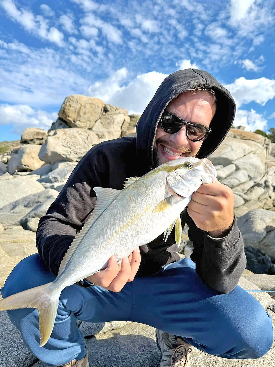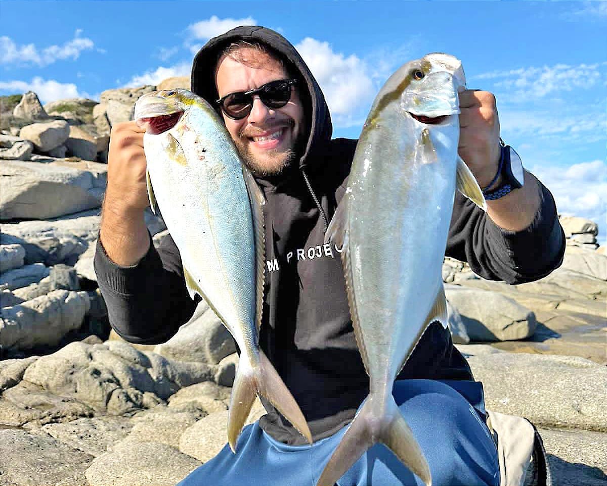foto sopra: Michele Anedda con due belle ricciole pescate dalla scogliera in una giornata assolata. La luce è un fattore da sfruttare perché questi predatori sono attratti dai bagliori e luccichii. Un bel jig con una colorazione argentea è, in questo caso, la scelta migliore.