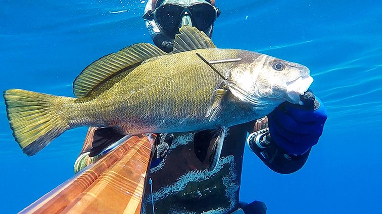 Marco Meledina nasce a Olbia il 2 marzo 1986. È sposato e di mestiere fa il termoidraulico, come il babbo. E come il babbo ha la passione del-la pesca in apnea. Distante dal vivace mondo agonistico al quale la Sardegna ha prestato una buona quantità di atleti, anche ai massimi livelli, risulta più vicino ai social media, ma senza strafare: una presenza discreta, ben bilanciata, in linea, probabilmente, con il suo a-plomb professionale. Il fatto di vivere in una città di mare, favorita, se vogliamo, in senso alieutico, non ha smosso il giovanotto più di tanto, non fino ai sedici anni, età in cui è diventato il proprietario di un arbalete, un T20 da 75 centimetri di Omer col quale ha fatto la gavetta e con cui ammazzava i pesci da Capo Ceraso a Capo Figari. Poca roba, dice lui: “Saraghi e cefali sul basso fondo, sostanzialmente, e qualche altra specie occasionale per fare la zuppa. Sempre in compagnia di mio babbo, spesso col gommone che teneva ormeggiato a Porto Marana, dove Marco Turchi gestisce il negozio di pesca. Oppure, qualche volta, ci spostavamo in motorino, con un amico.”. Così, la storia di Marco finché… finché si sposa. Michela non solo gli dà felicità e sicurezza ma anche il “permesso” di allargarsi con la pesca. Le uscite, infatti, incrementano di numero e così le dimensioni delle prede. Marco è davvero felice, sentimento che condivide ancora col babbo e Mariano Satta, lo stesso, protagonista, su queste pagine, lo scorso mese.