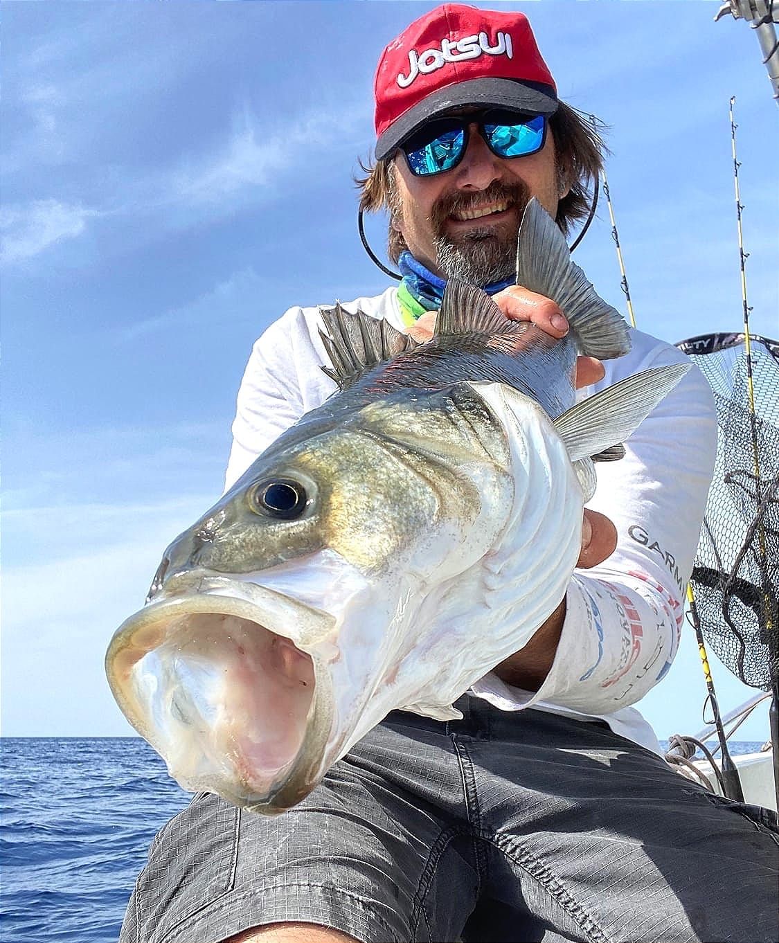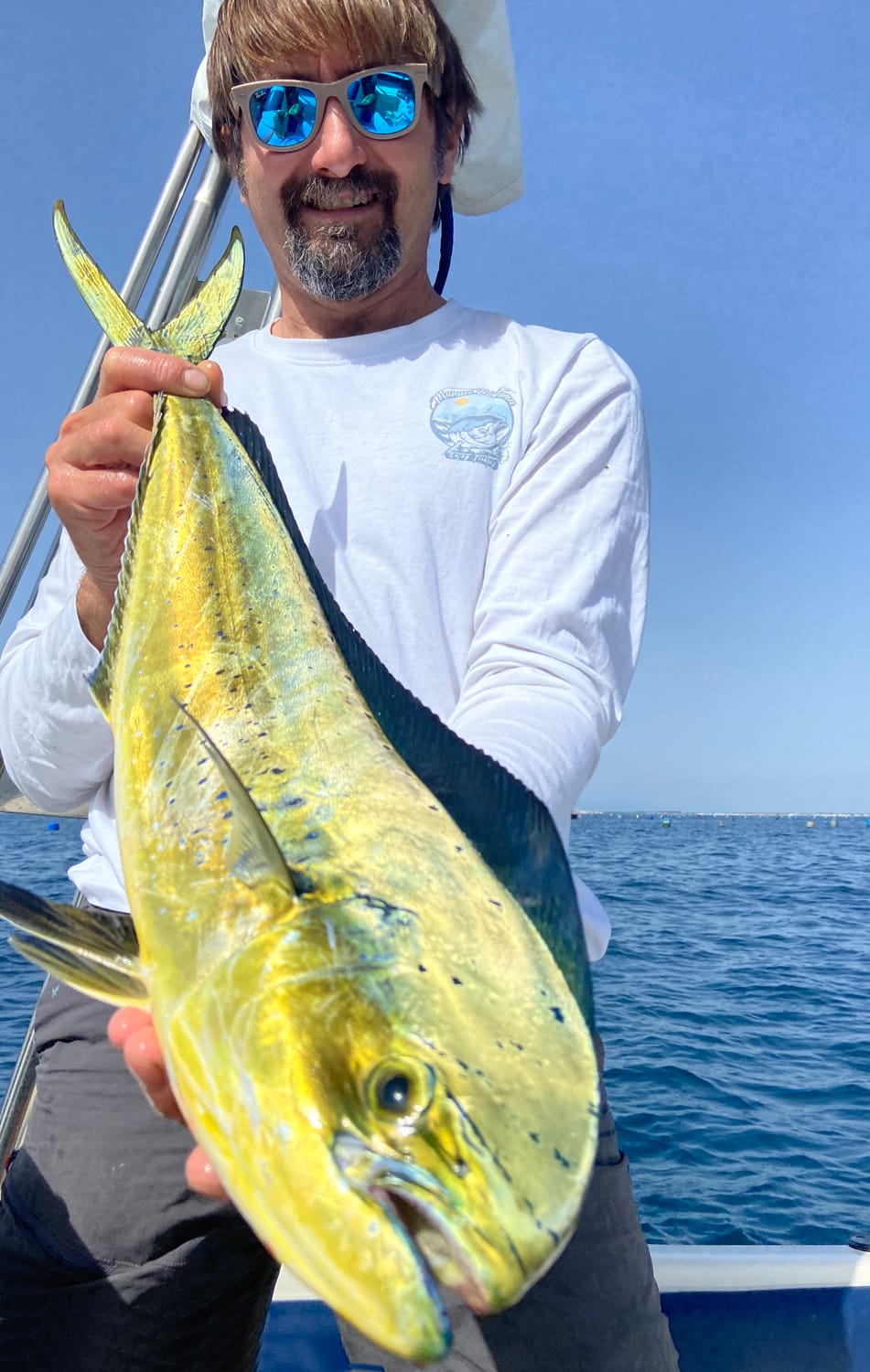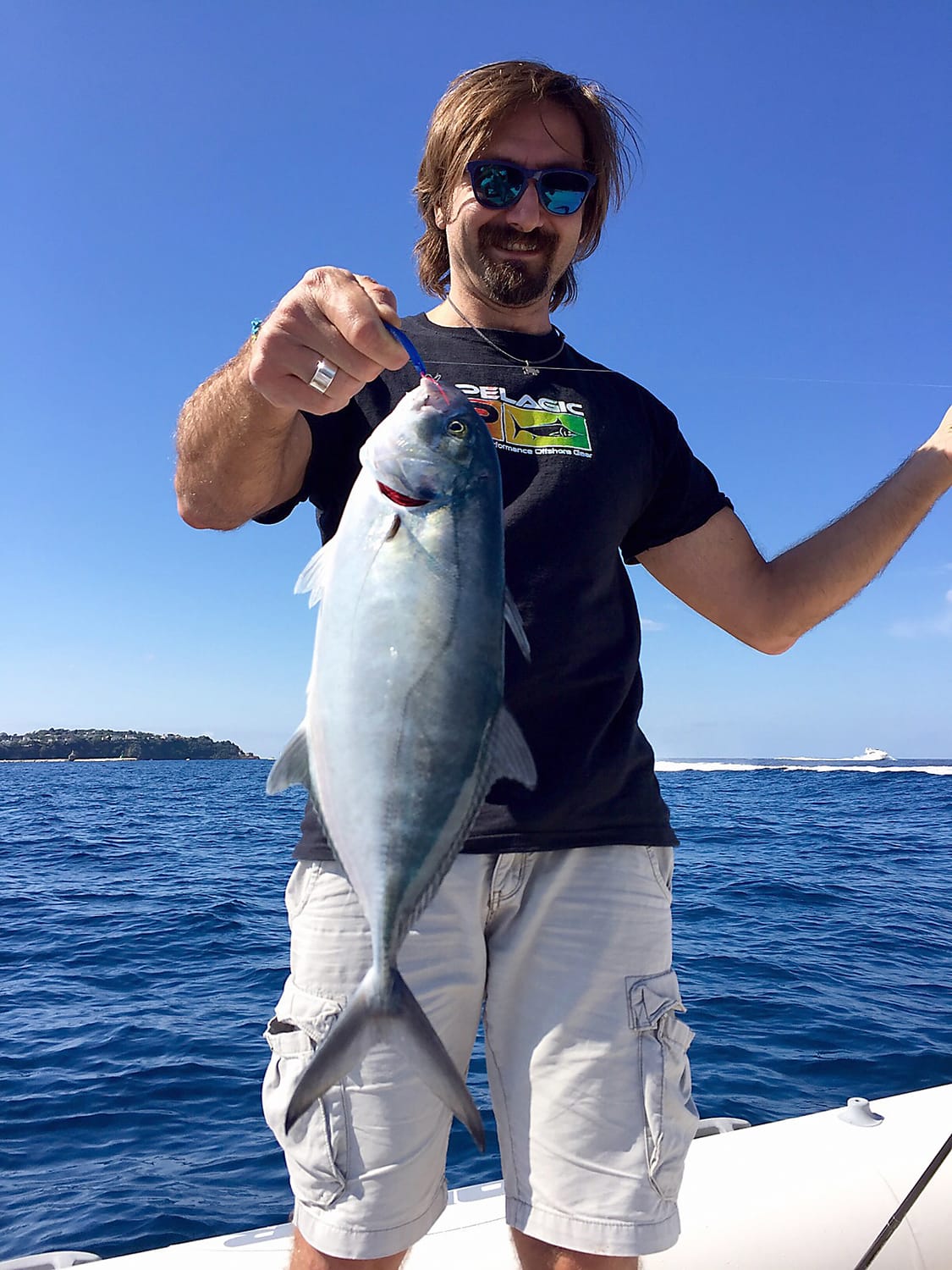 Manuel posa soddisfatto con una meravigliosa lampuga e un carango mediterraneo (Caranx crysos).