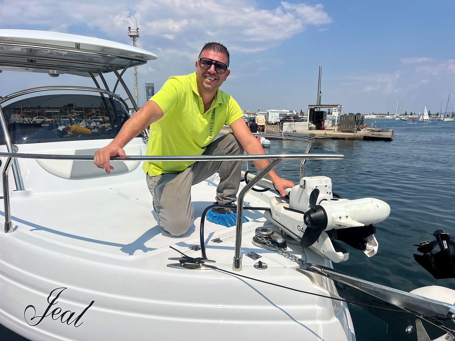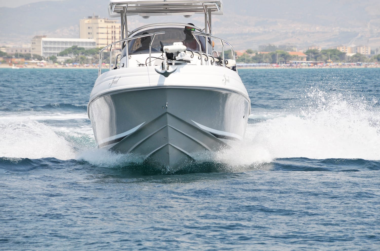 Il modello che abbiamo provato, di proprietà dell’imprenditore cagliaritano Massimo Medda, suggerisce l’ingresso a prua, facilitato da un’interruzione della battagliola che consente inoltre, un sicuro movimento del motore elettrico di prua, a fianco del quale, con discrezione, si trova il salpa ancora elettrico. E tanto basta per farci intendere che oltre al semplice diporto si potrebbe opzionare anche un’emozionante uscita a pesca.