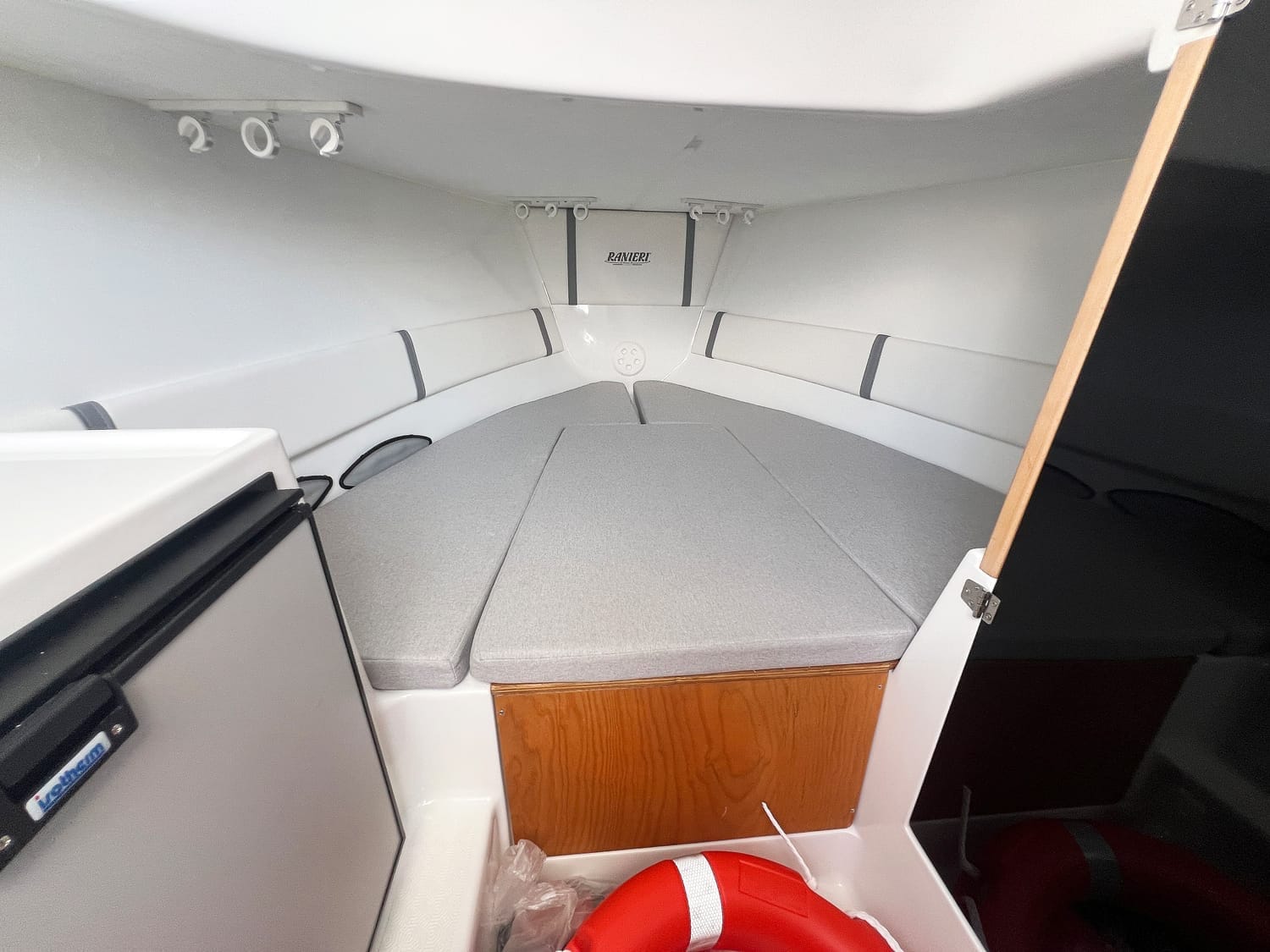 Quest’area è il luogo deputato ai momenti di convivialità, ma è anche lo spazio del pescatore dove tutto l’occorrente è a portata di mano. La murate sono imbottite e alte per rendere confortevole l’azione di pesca anche col mare mosso. Tutto il calpestabile è rivestito in Eva antiscivolo, sempre utile per la sicurezza oltreché per dare un tono di eleganza che non guasta mai. Le dotazioni sono complete. Ad esempio per la pesca, incassati nelle murate, si trovano un lavello, una vasca per il vivo e una per il pescato e ancora ben due porta canna per lato, e altri da riposo, 4 dei quali sul soffitto del vano letto.