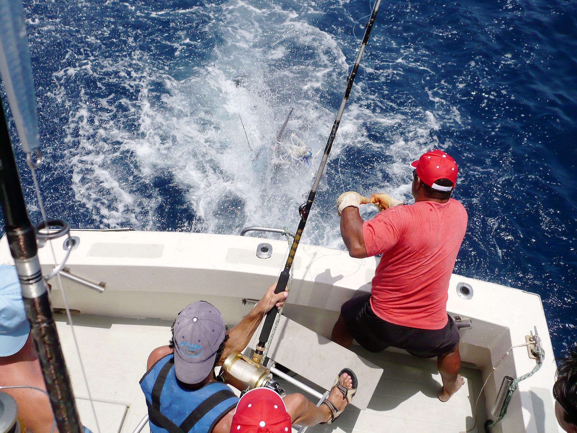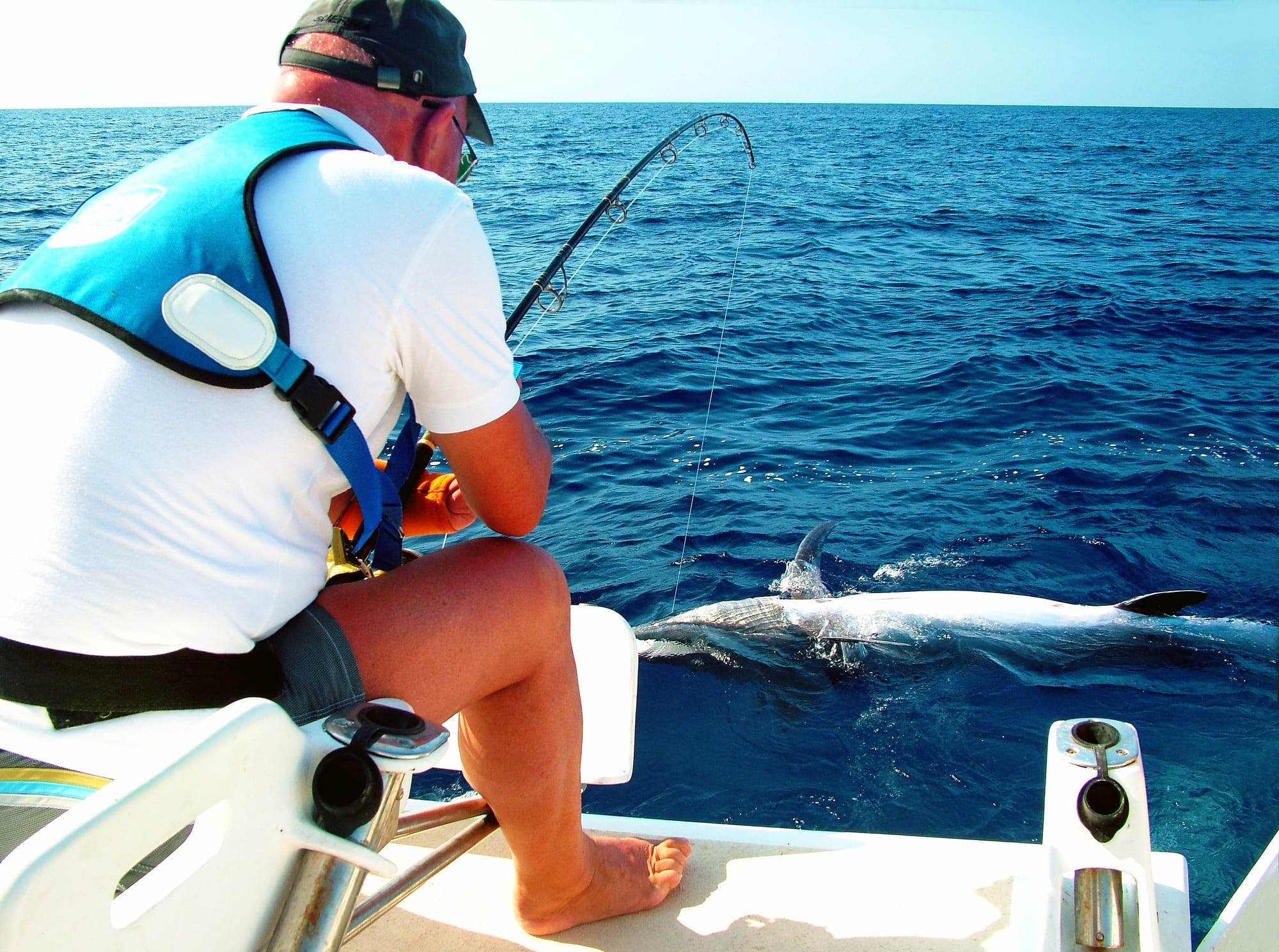 I grandi marlin si possono pescare con tecniche diverse: traina veloce d’altura con grandi kona, esche naturali vive o morte (per lo più bonito o rainbow runner) oppure con la tecnica che adottano molti skipper moderni il pitch bait, assai divertente e redditizio. Pescando con i kona l’assetto di pesca può essere quello classico, con quatto esche in acqua, con due filate dagli out-rigger e due dal baglio del pozzetto ed eventualmente una quinta filata lunga. Pescando con esche naturali abbiamo l’opzione del vivo o del morto: con il vivo si potranno filare in acqua un paio di esche con montaggio catalina e posizionate alla profondità voluta tramite l’impiego dell’affondatore, si tratta in pratica di una traina lenta, ma se la barca non è dotata di affondatori possiamo praticare una sorta di drifting ed assettando la barca con piccoli spostamenti con il motore.