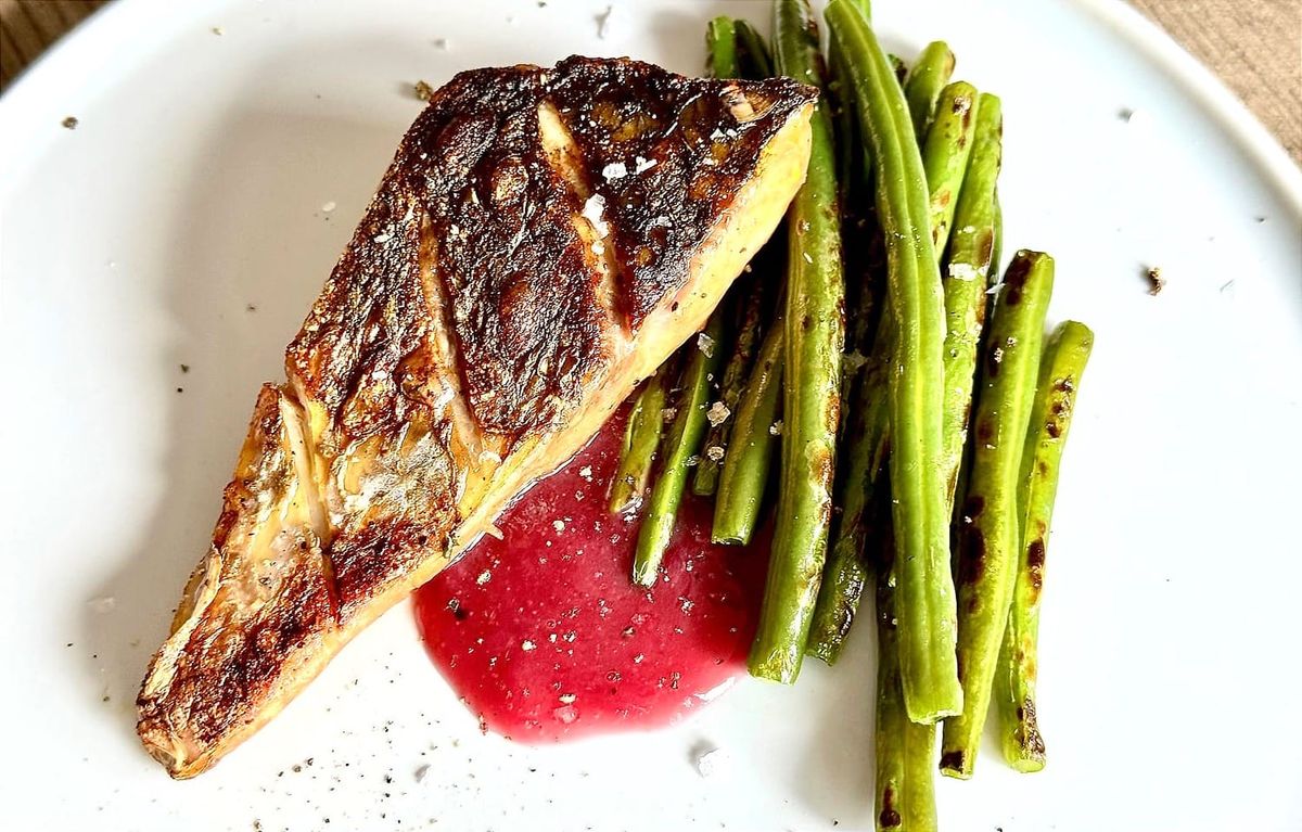 In un piatto piano disponete a piacimento un poco di salsa di melagrana che avete avuto l’accortezza di tenere tiepida. Adagiate il trancetto o i trancetti di muggine con la pelle rivolta verso l’alto e aggiungete i fagiolini. Completate con una macinata generosa di pepe nero e qualche fiocco di sale Maldon. Non resta che mangiarlo!
