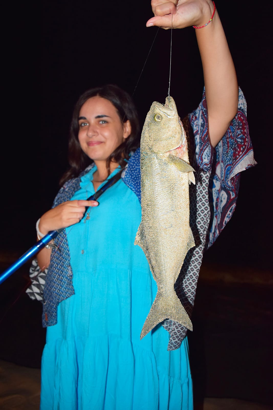 Foto d'apertura: Tommaso Melis solleva un serra, pescato a Pula, sfruttando le sue lunghe leve per lanciare lontanissimo l’esca composta da un “salsicciotto” di muggine. Qui sopra: l’autore con un “dentone” catturato poco dopo la mezzanotte, nella spiaggia dell’Abamar, a Santa Margherita di Pula. Una perplessa Maria Melis solleva un serra del peso di oltre due chili, appena pescato nella spiaggia del Flamingo.