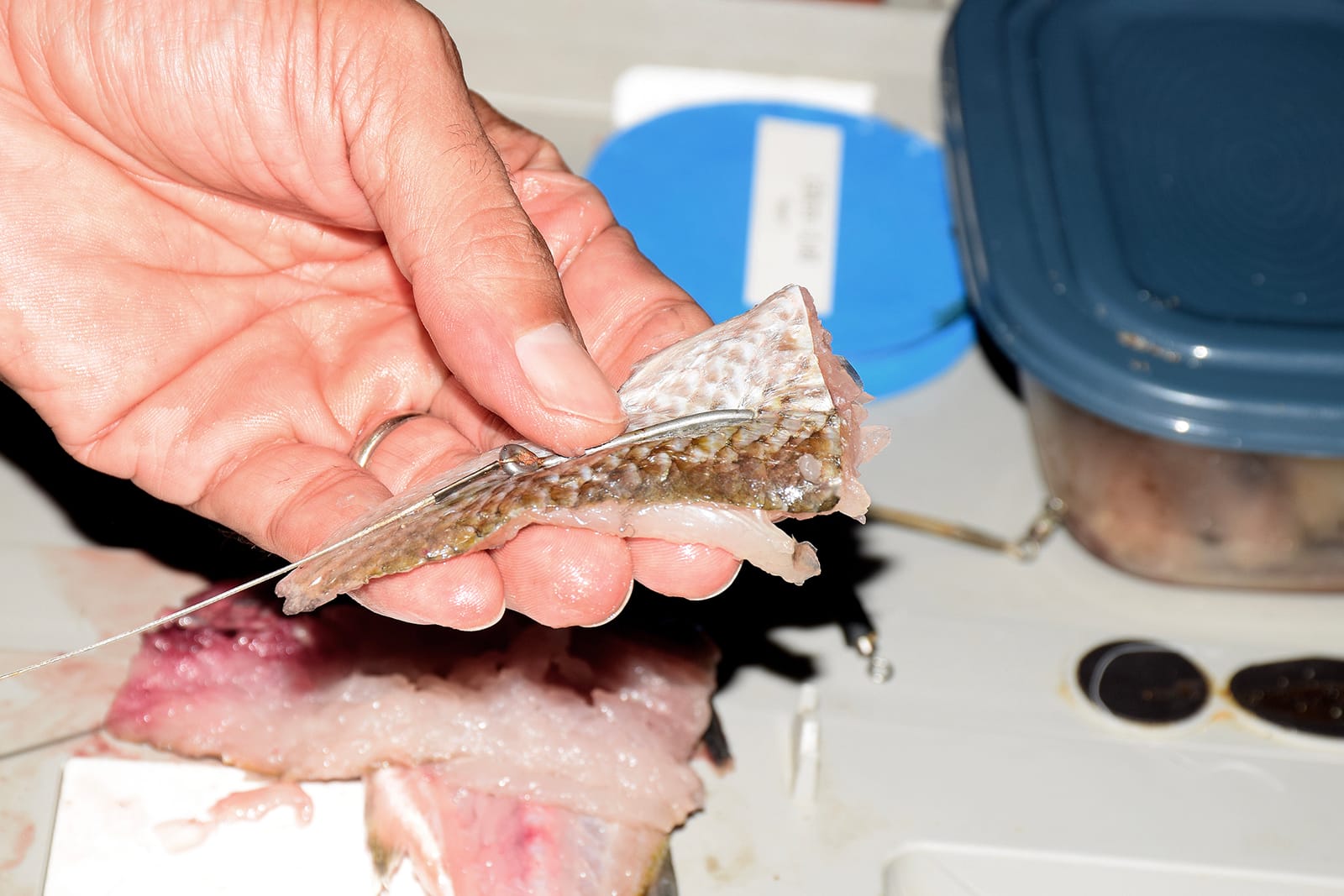 Fasi di preparazione per un trancio di muggine davvero gourmet: lo chef Fabrizio Frongia sfiletta sul posto un muggine di taglia media; l’unico amo è puntato sull’esca dalla parte della pelle; con l’aiuto di un grosso e lungo ago, chef Frongia rifinisce con filo elastico.