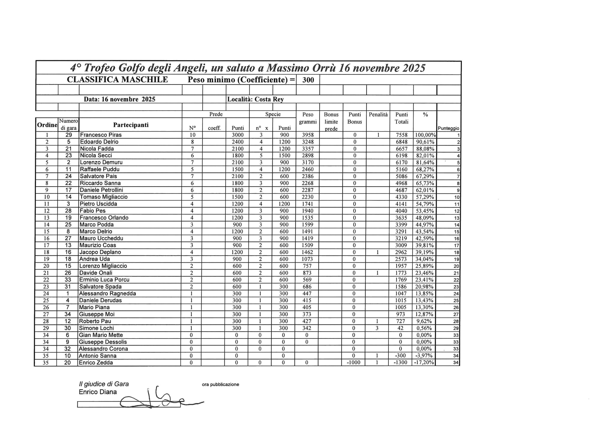 Ad aggiudicarsi la prova è Francesco Piras, alla seconda vittoria in due gare, con ben 10 prede valide; secondo posto con 8 prede per Edoardo Delrio, anche lui conferma il risultato della prima prova; terzo posto: Nicola Fadda con 7 prede, che migliora il quarto posto ottenuto nella precedente selettiva.