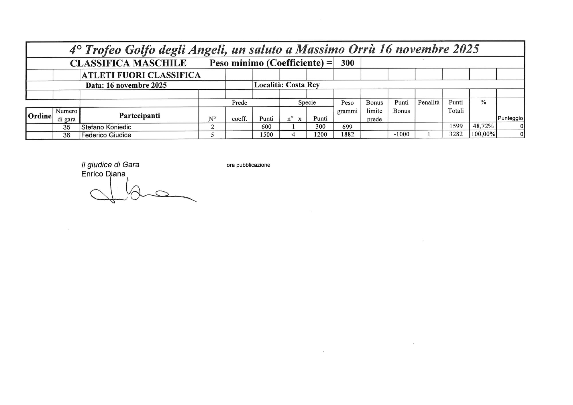 Le catture non si fanno attendere, ma dopo poco più di mezz’ora arriva l’episodio destinato a rimanere negli annali delle gare: l’atleta Alessandro Corona, durante una fase concitata dell’azione, è rimasto ferito a una gamba a causa della fiocina.