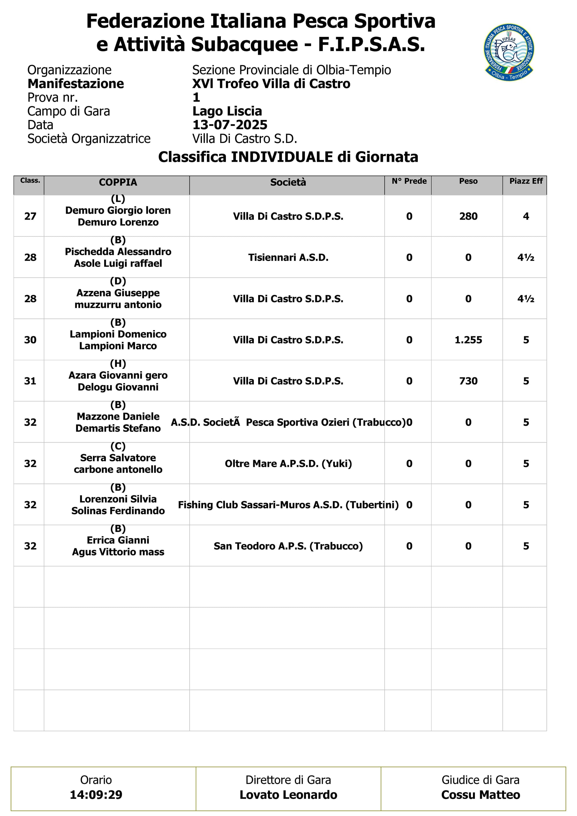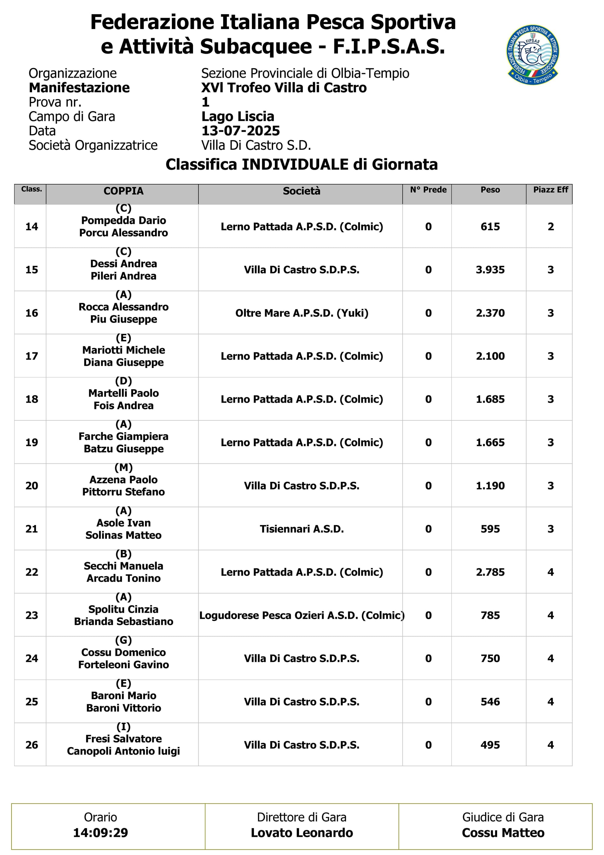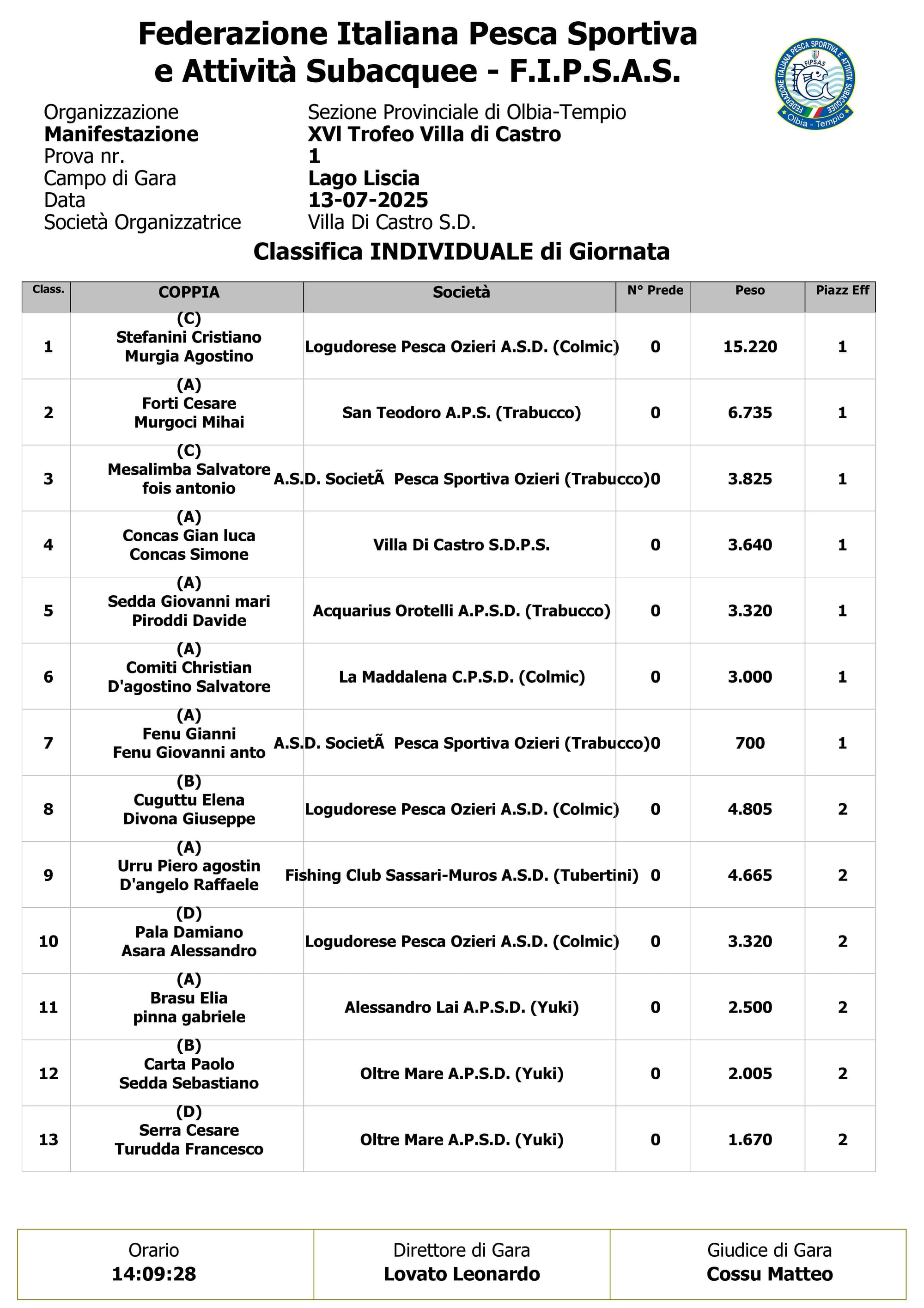 Terza coppia classificata, Salvatore Mesalimba e Antonio Fois, della società Pesca Sportiva Ozieri; seconda coppia, Cesare Forti e Michel Murgici. Prima coppia assoluta Stefanini Cristiano e Murgia Agostino della Logudorese pesca Ozieri. Ma vorrei citare anche la quarta coppia, Gian Luca Concas e il figlio di 9 anni Simone della Villa di Castro, che si sono confrontati con i professionisti e nonostante Simone sia un bambino non ha mai mollato un secondo.